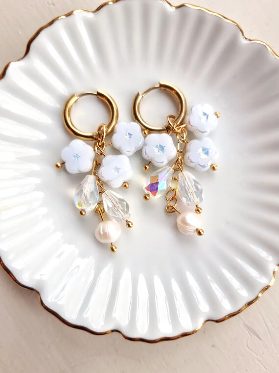 Metalliosat ovat 14k kullattua kirurginterästä. Helmet ovat tsekkiläisiä lasihelmiä ja makeanvedenhelmiä.