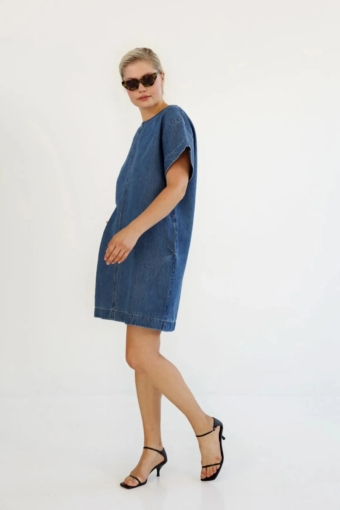 This denim dress has a boxy silhouette and it’s designed for a relaxed, slightly oversized fit. Knee length, side pockets and detailed stitching.