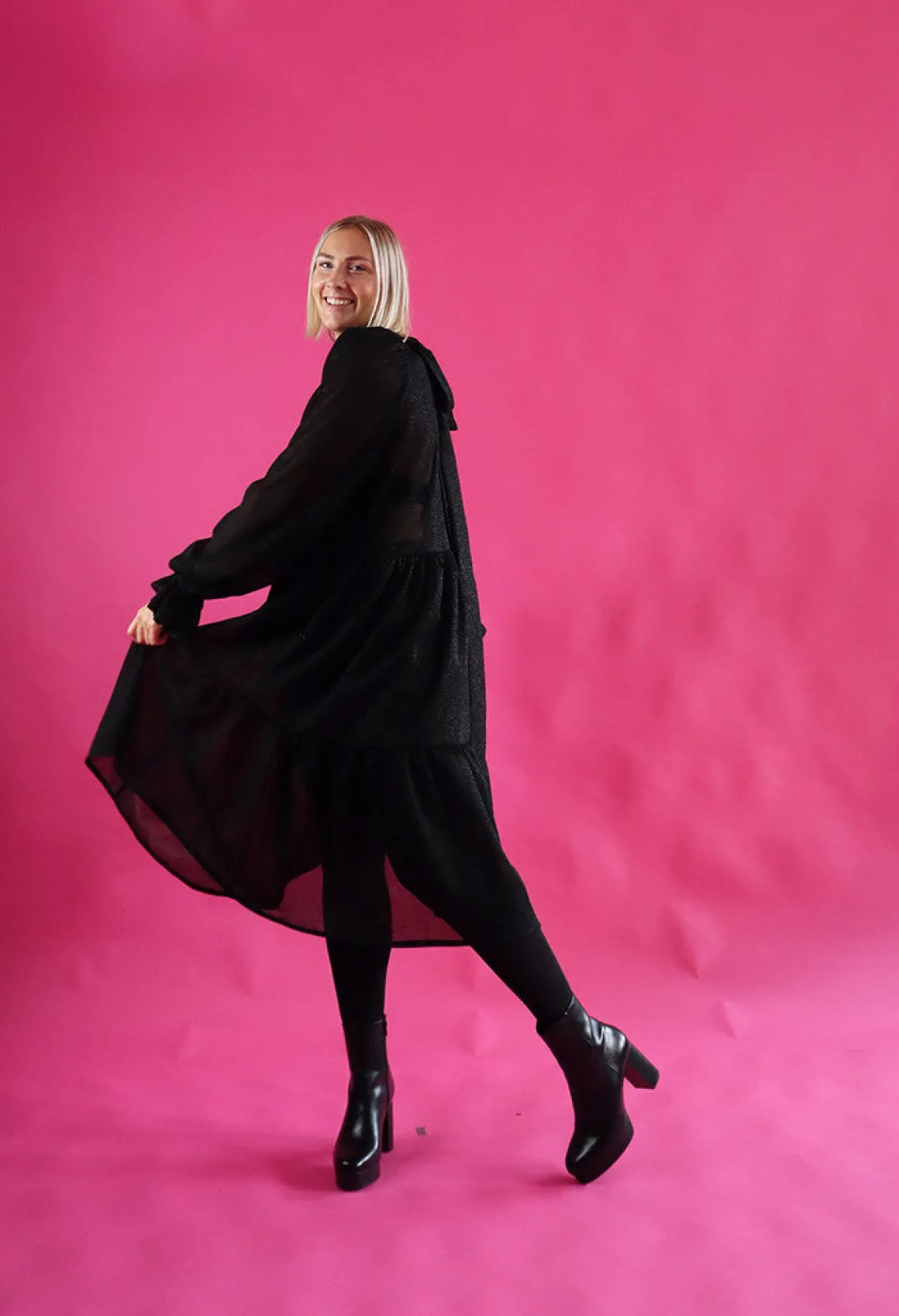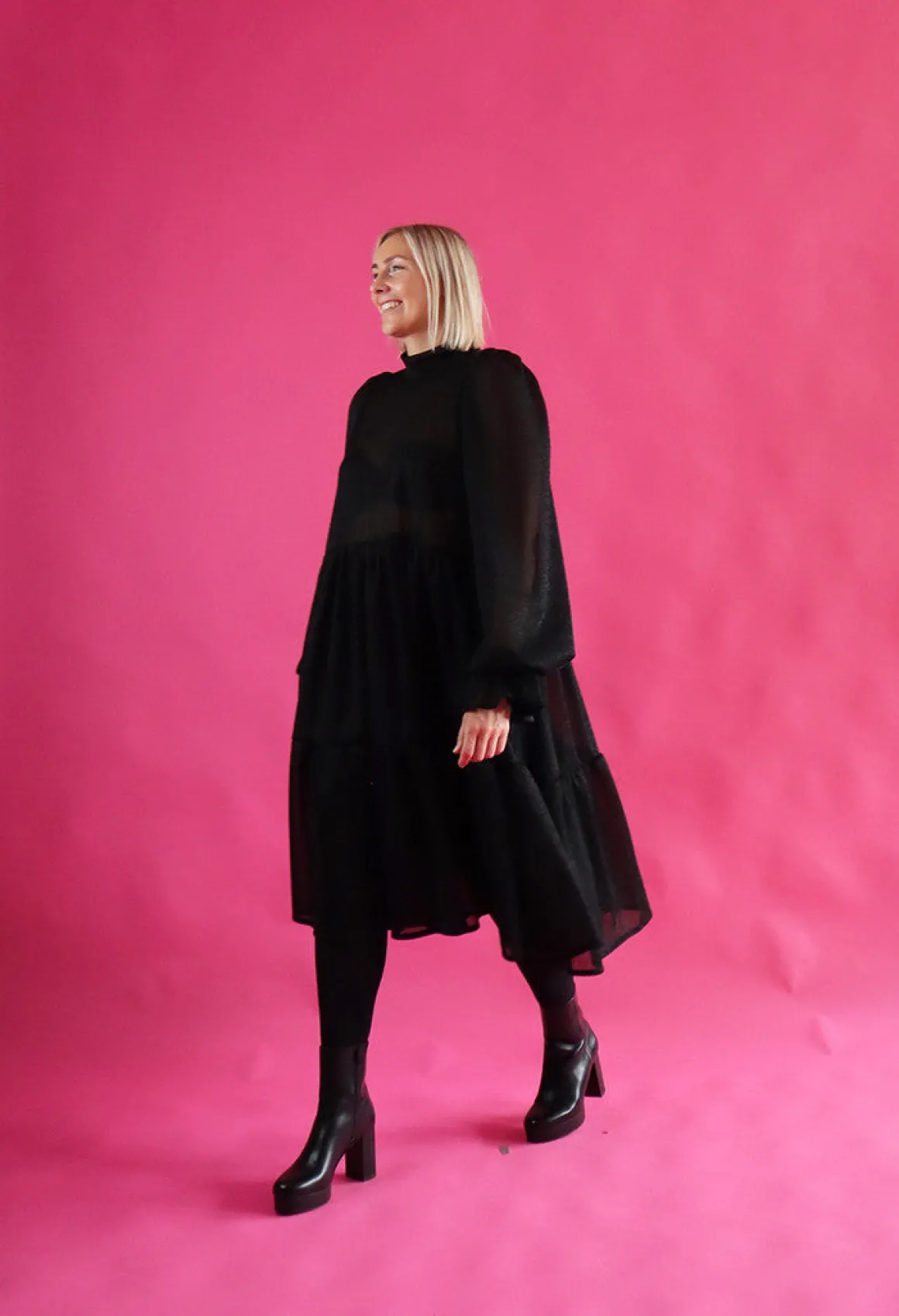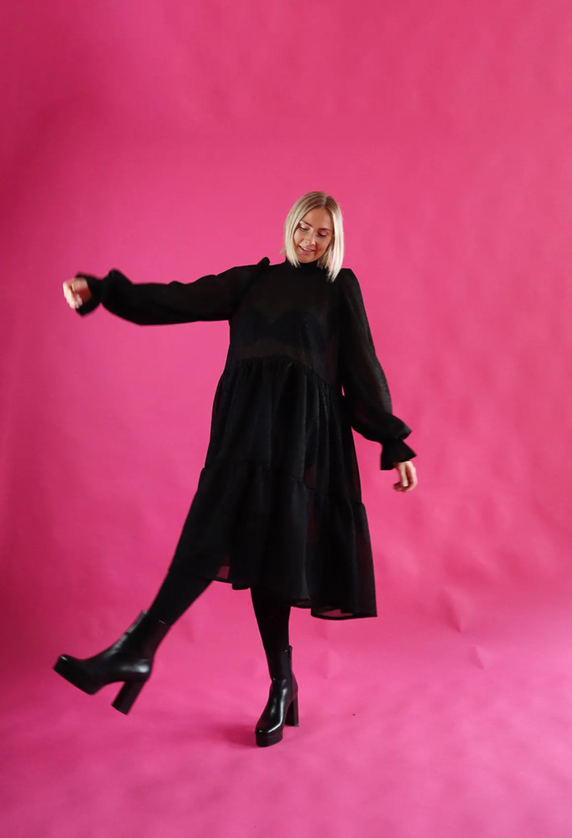 Dishy- mekko on istuvuudeltaan väljä ja sen helmassa on runsas röyhelöleikkaus. Mekko laskeutuu kauniista, mutta pitää runsaan muotonsa. Mekossa on oversize pitkät puhvihihat ja taskut sivusaumoissa. Mekossa on kapea huivikaulus joka solmitaan taakse. Mekko on pohjepituinen.