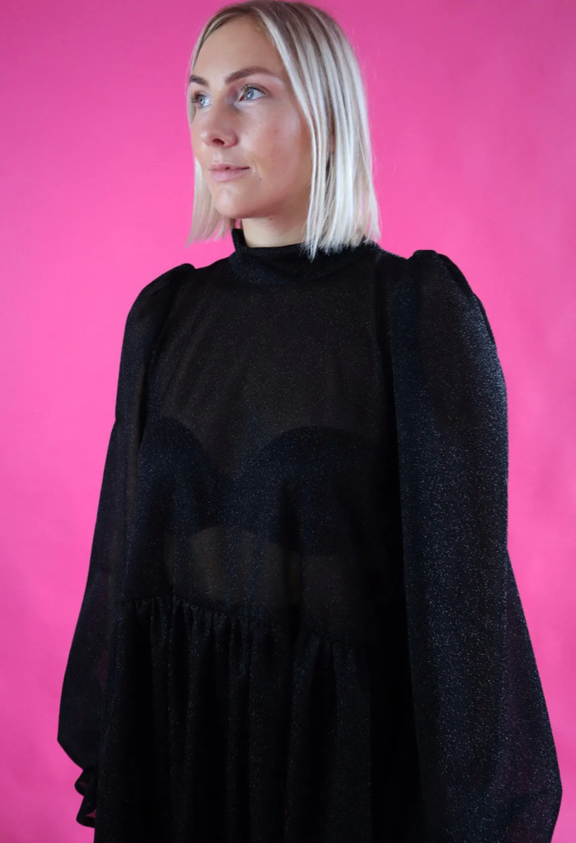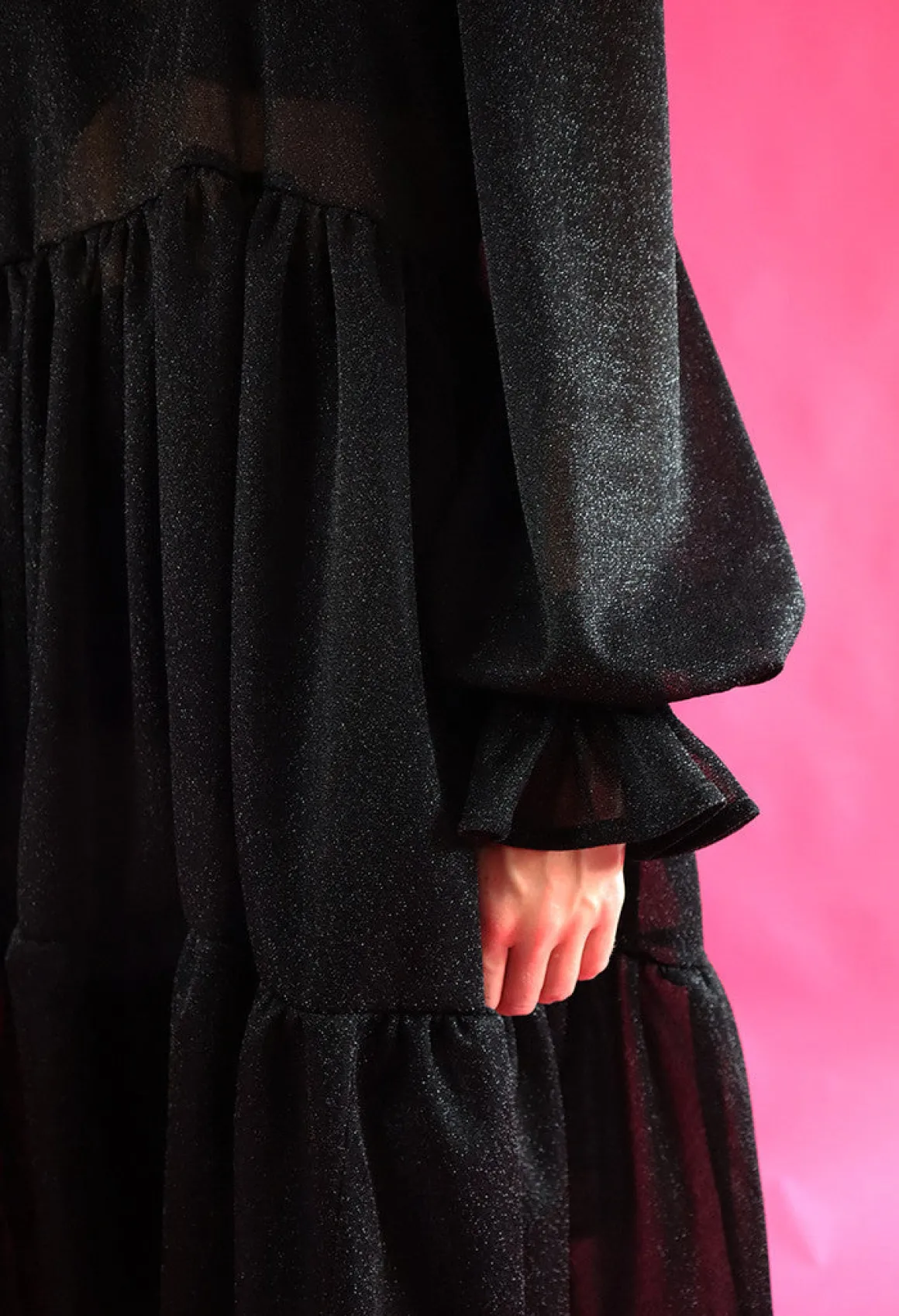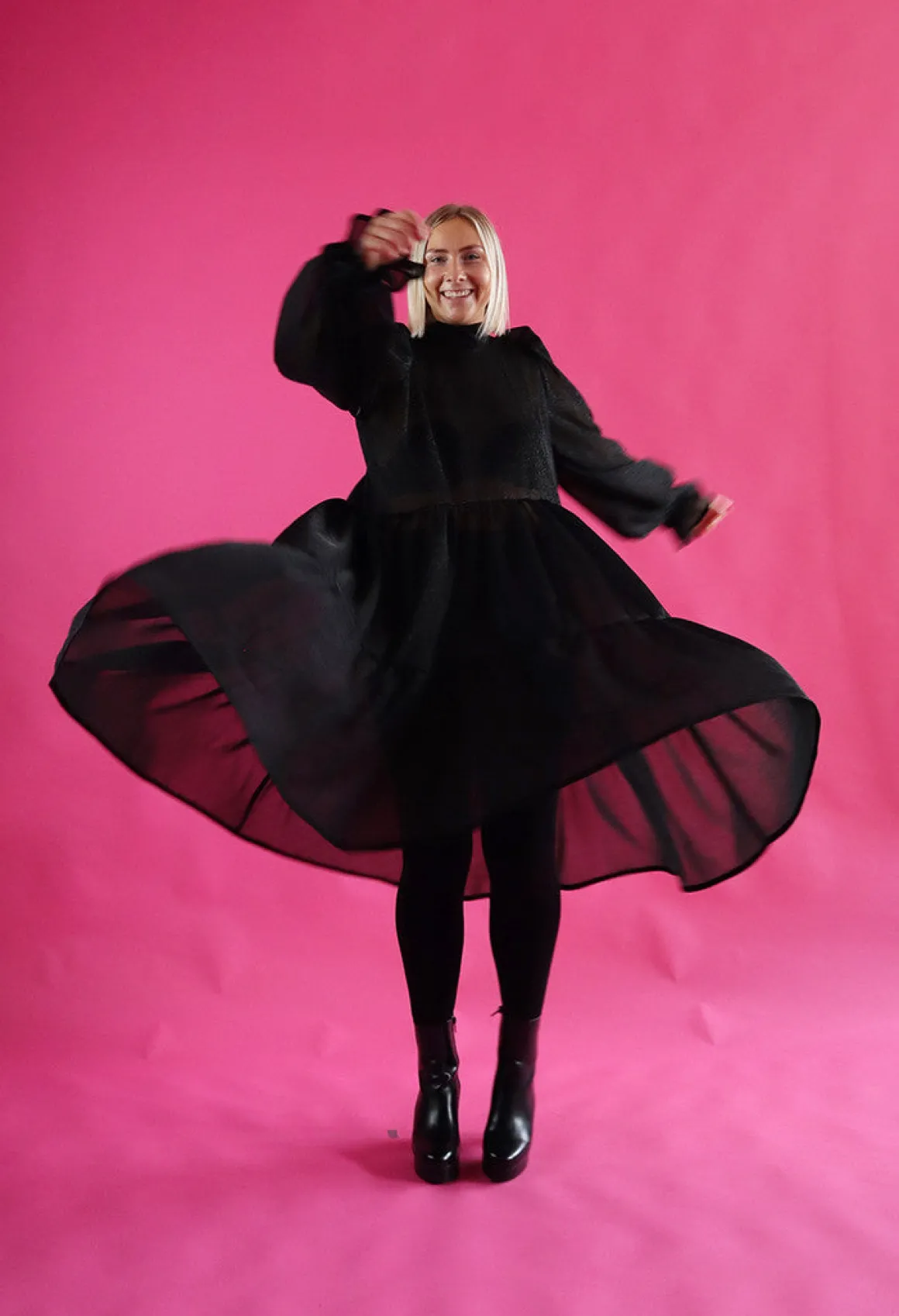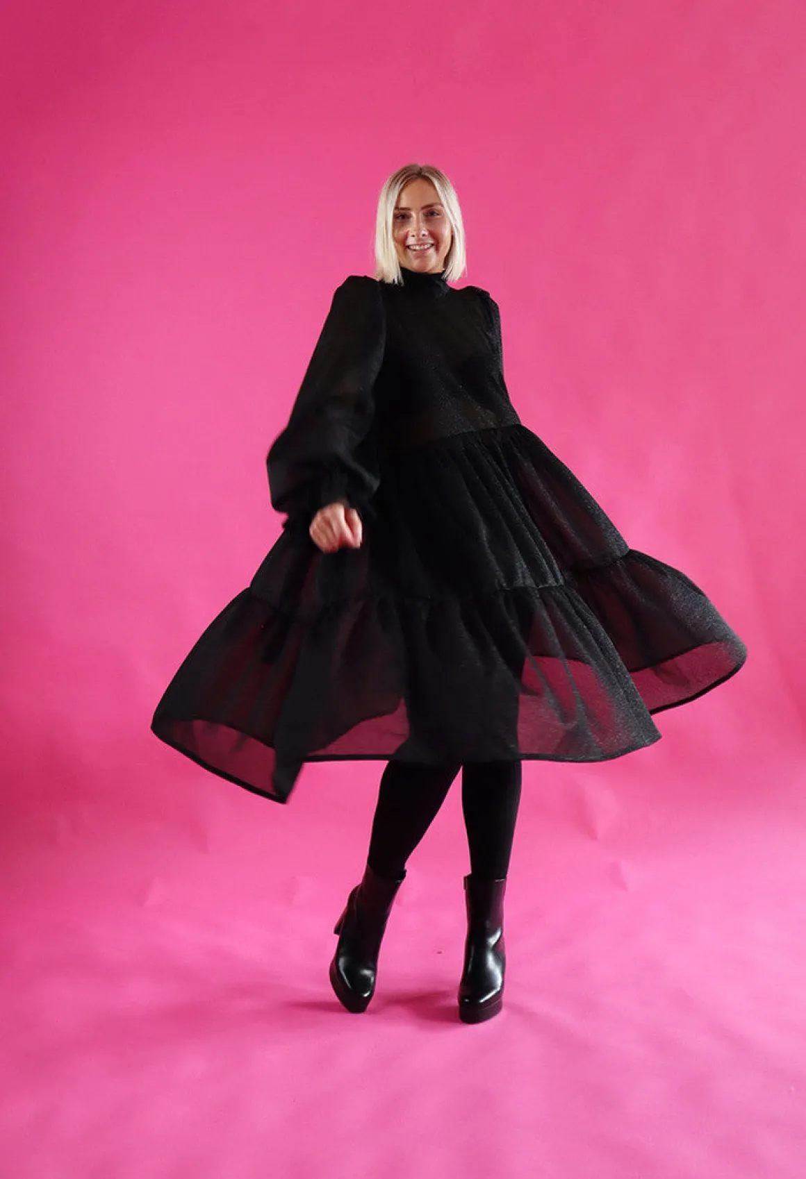 Dishy- mekko on istuvuudeltaan väljä ja sen helmassa on runsas röyhelöleikkaus. Mekko laskeutuu kauniista, mutta pitää runsaan muotonsa. Mekossa on oversize pitkät puhvihihat ja taskut sivusaumoissa. Mekossa on kapea huivikaulus joka solmitaan taakse. Mekko on pohjepituinen.