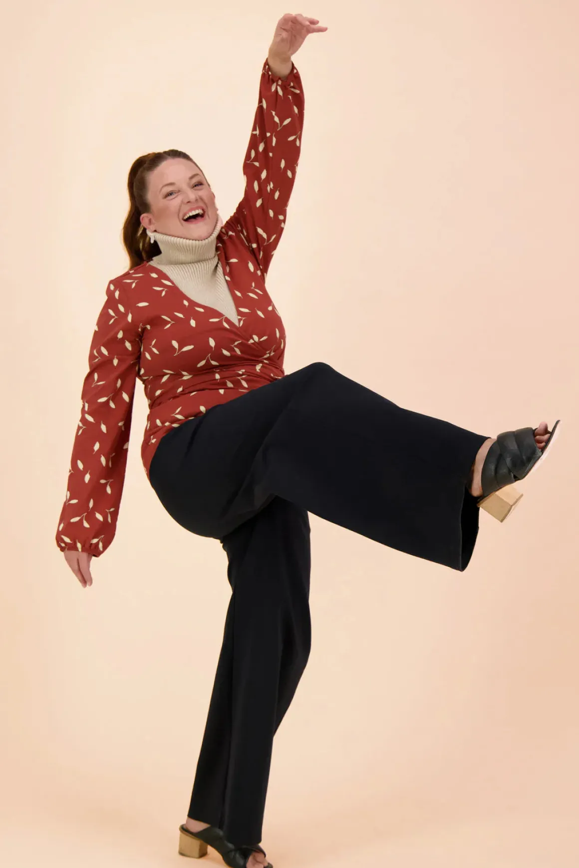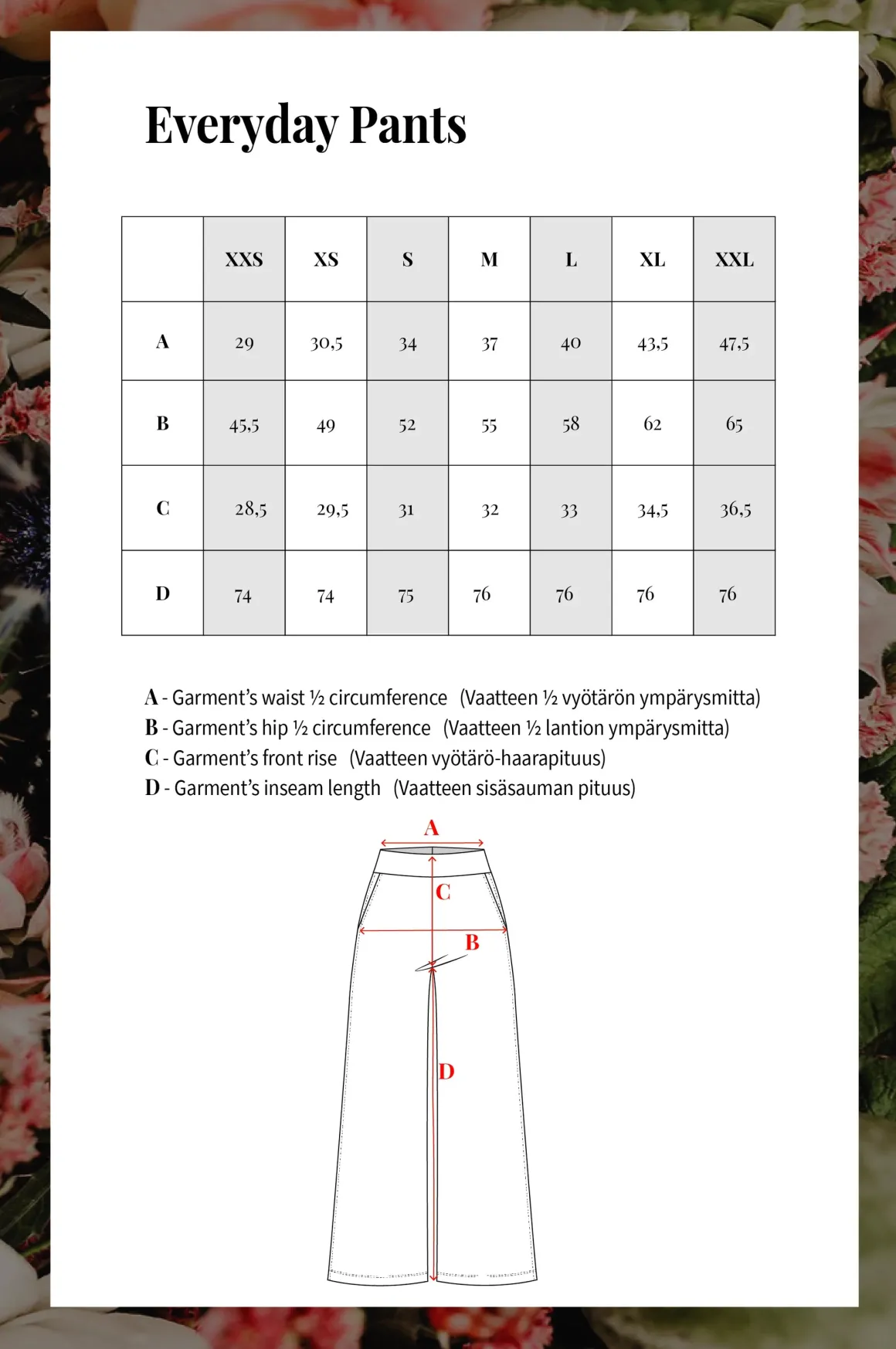 Skarpit Everyday Pants -housut eivät tingi mukavuudesta. Napakasta ja joustavasta ponte roma -interlock-neuloksesta valmistetut housut näyttävät skarpeilta, ja tuntuvat päällä ihanan pehmeiltä. Housuissa on leveä joustava vyötärö (5 cm korkea) ja edessä taskut. Sivusaumoissa kulkee denim-tikkaus, joka luo housuihin ekstraskarppia fiilistä. Housuissa on täyspitkä lahje (katso sisäsauman pituudet mittataulukosta, viimeinen kuva).