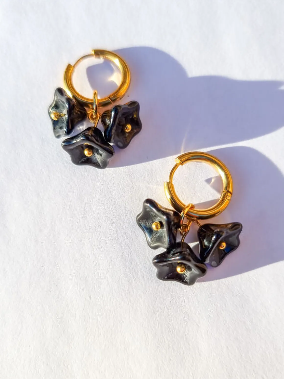 Kukan muotoiset lasihelmet, jotka kimaltavat kauniisti auringossa.