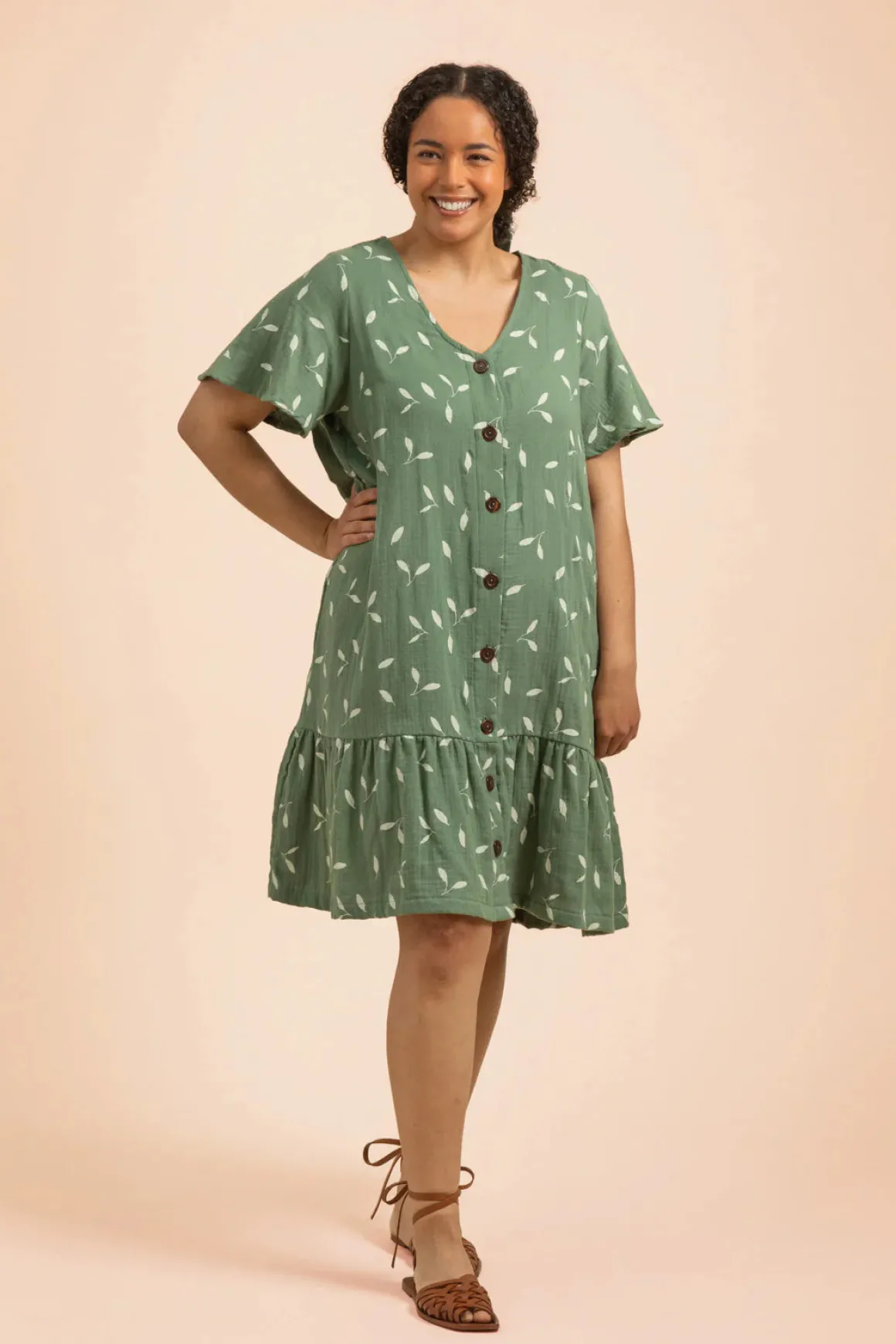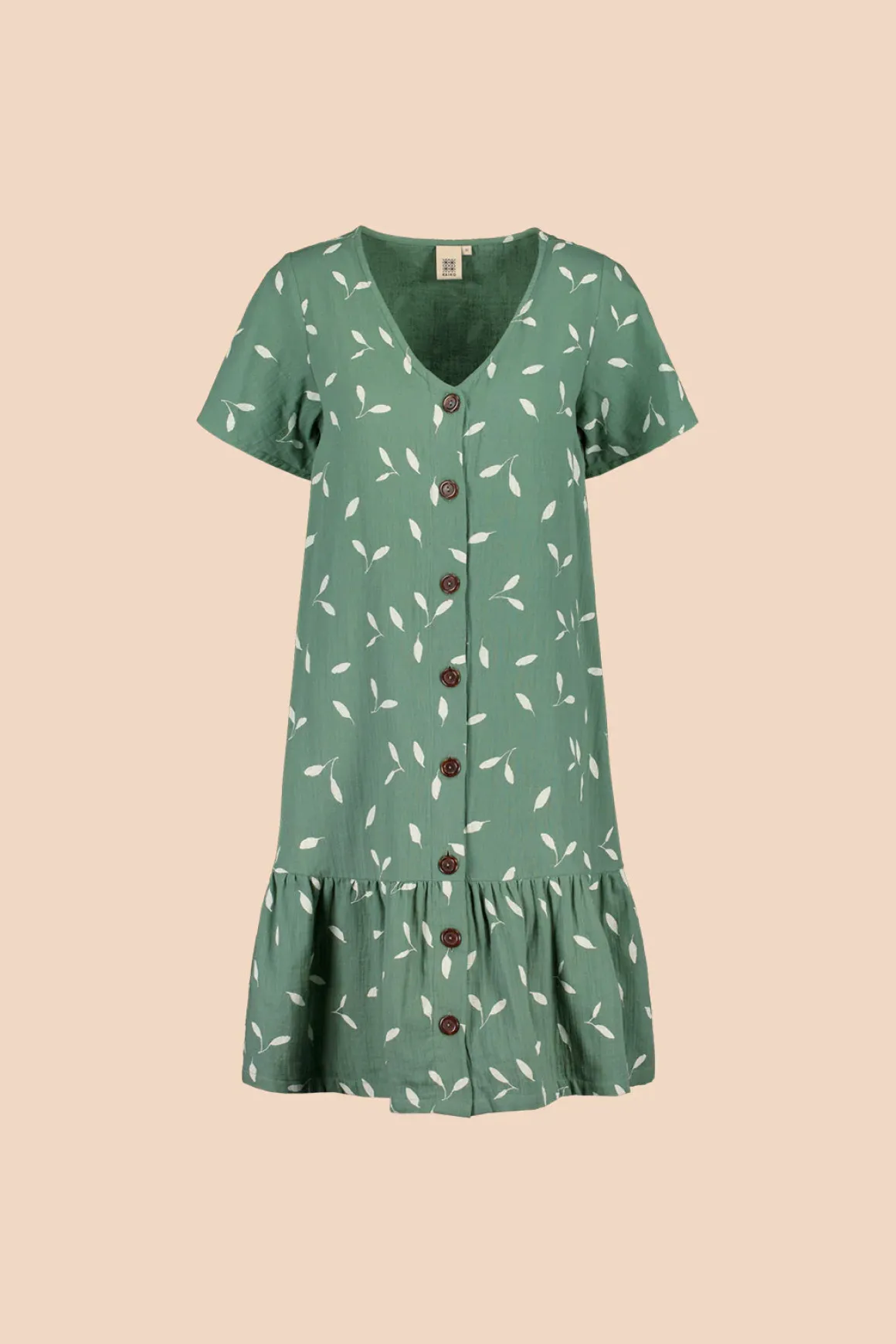 Vastuullisesti valmistetussa mekossa on väljä istuvuus, v-pääntie, kevyesti kellotetut hihat ja keskellä edessä kulkee nappirivi. Helmaa koristaa poimutettu frilla. Frillan korkeus 25 cm. Helman pituus noin polvimittainen. Kuosina Sage Wind, jonka murretun vihreää pohjaa koristavat minimalistiset lehtikuviot.