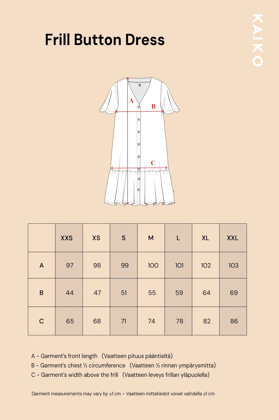 Mukava ja rento naisten mekko Frill Button Dress on valmistettu luomupuuvillamusliinista. Materiaalin valloittavan pehmeä ja eläväpintainen tekstuuri tekee mekosta erityisen mukavan päällä.