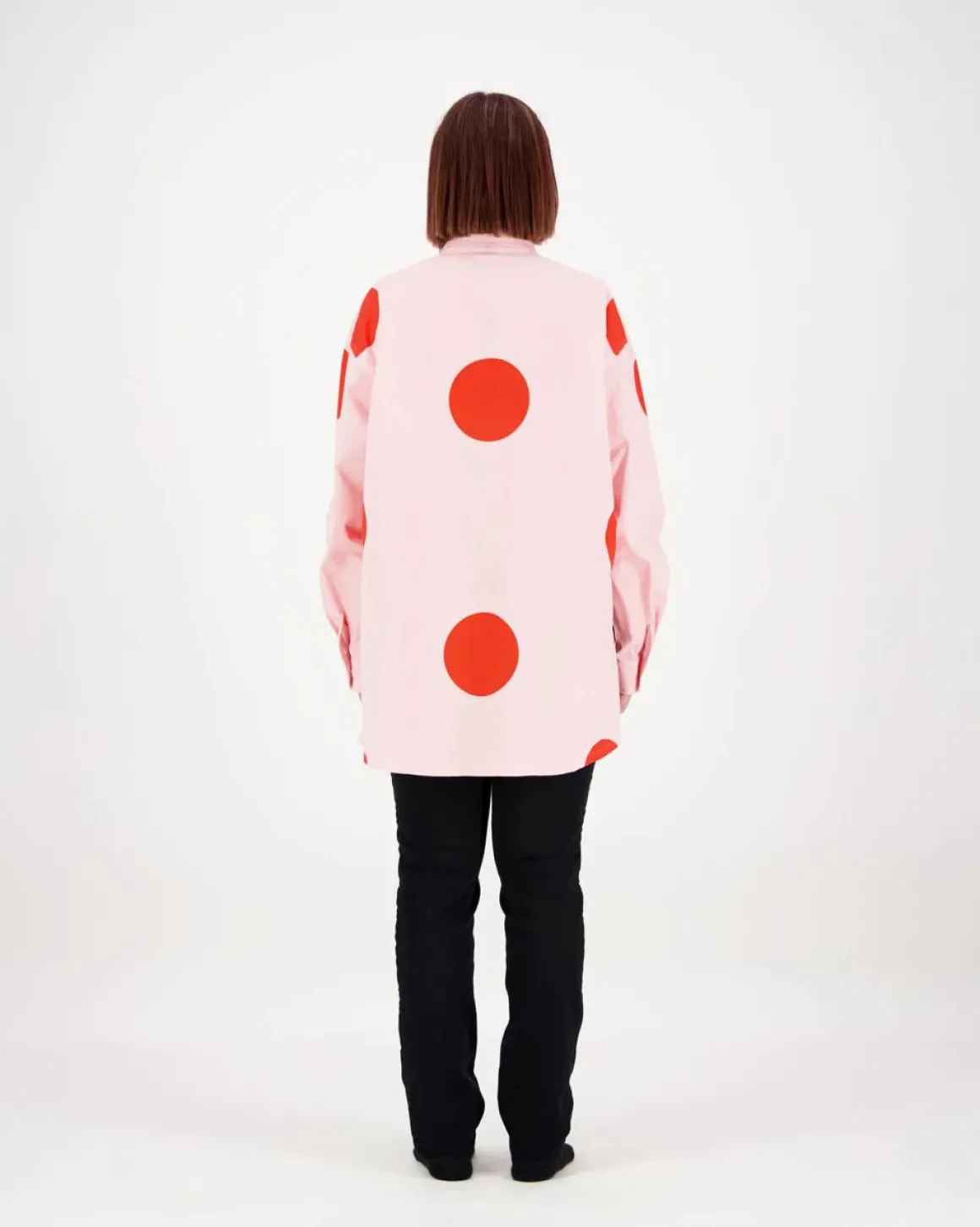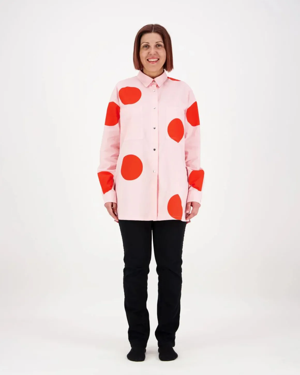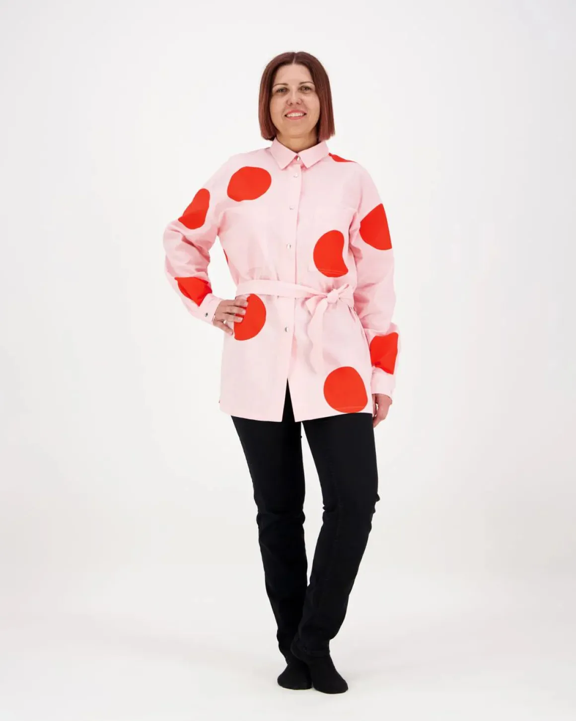 Rento oversize yhden koon kauluspaita. Paidassa on kaksi rintataskua, nepparit edessä ja hihansuissa, halkiot sivussa ja laskokset takana. Paidan mukana tulee myös irrallinen vyö samassa kuosissa, joka mahdollistaa paidalle myös toisenlaisen käyttötarkoituksen. Värien järjestys paidassa vaihtelee ja voi poiketa kuvasta.