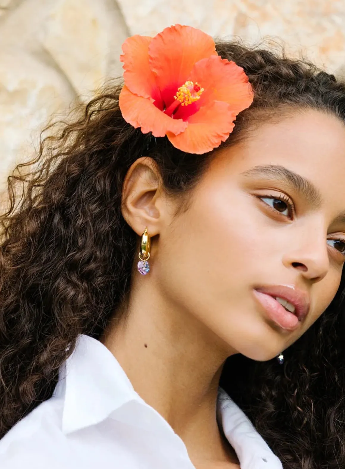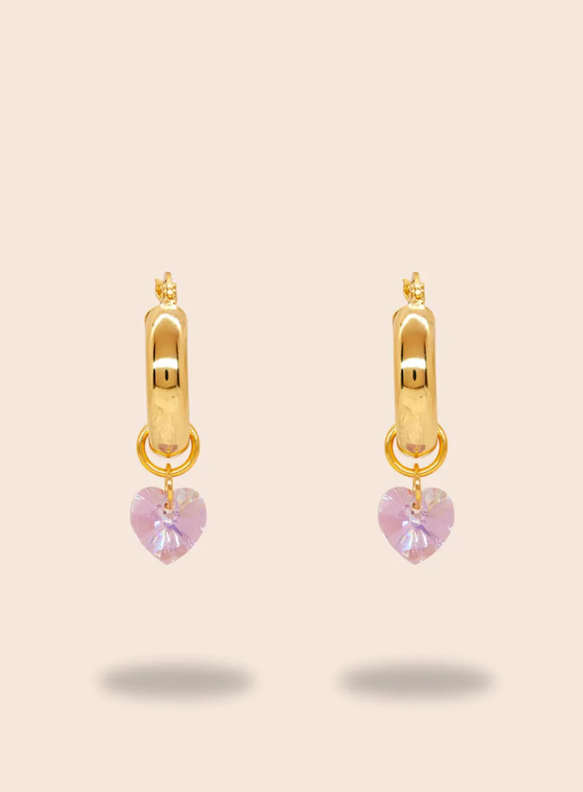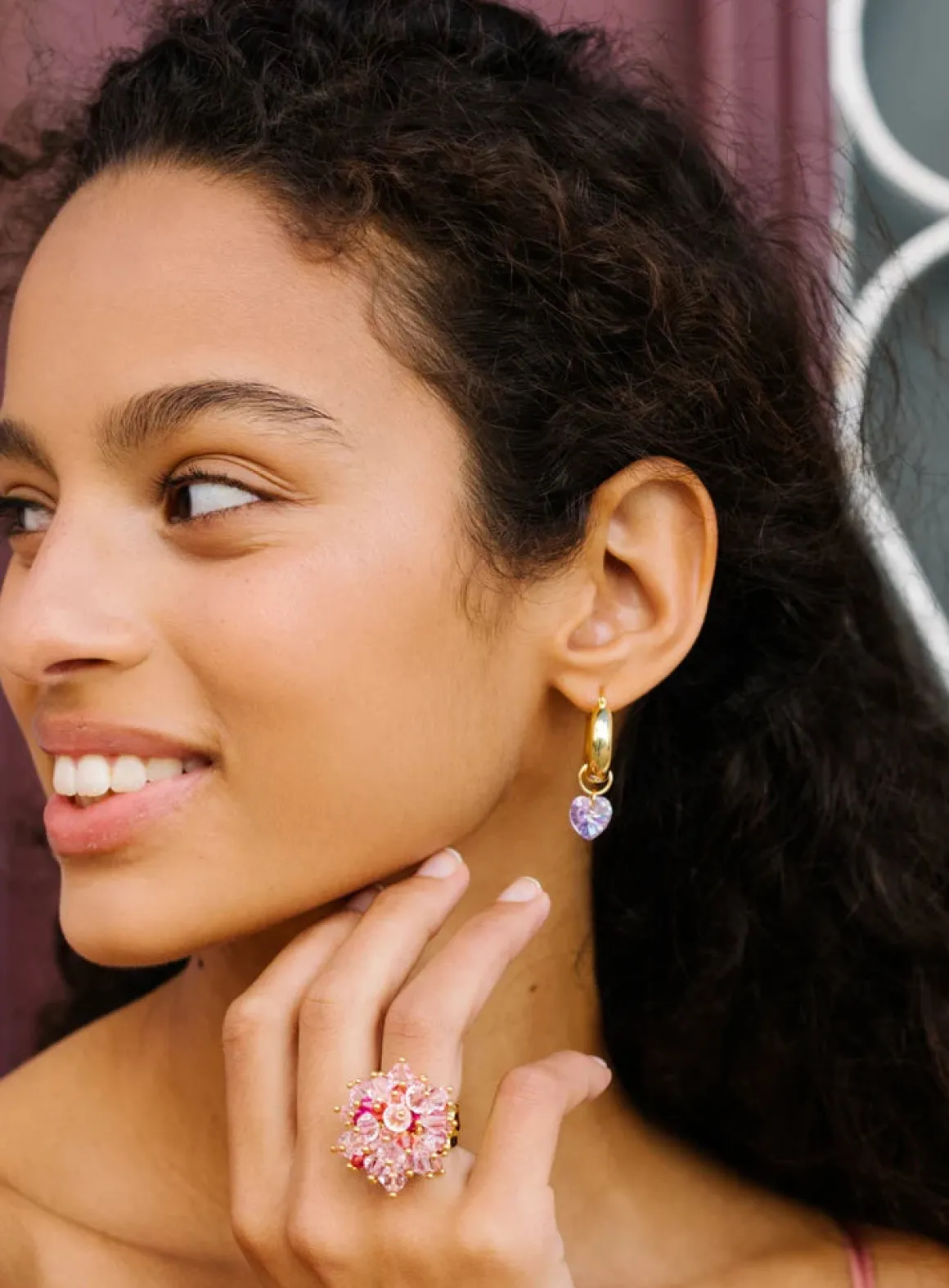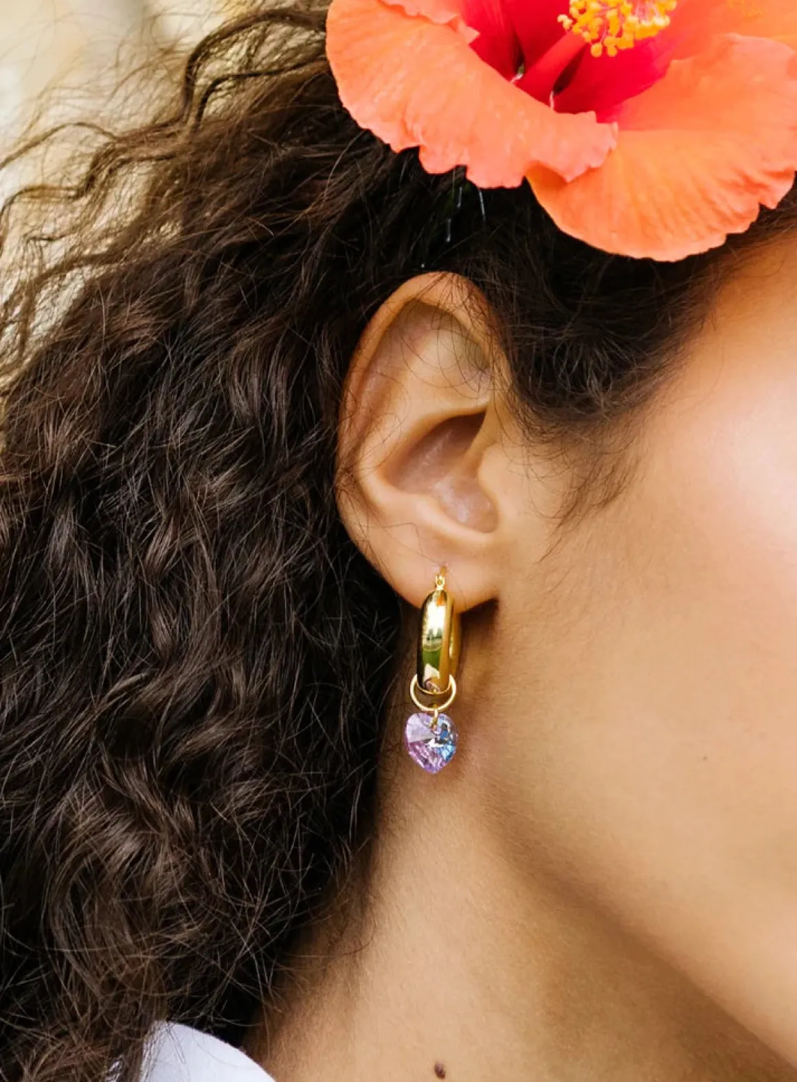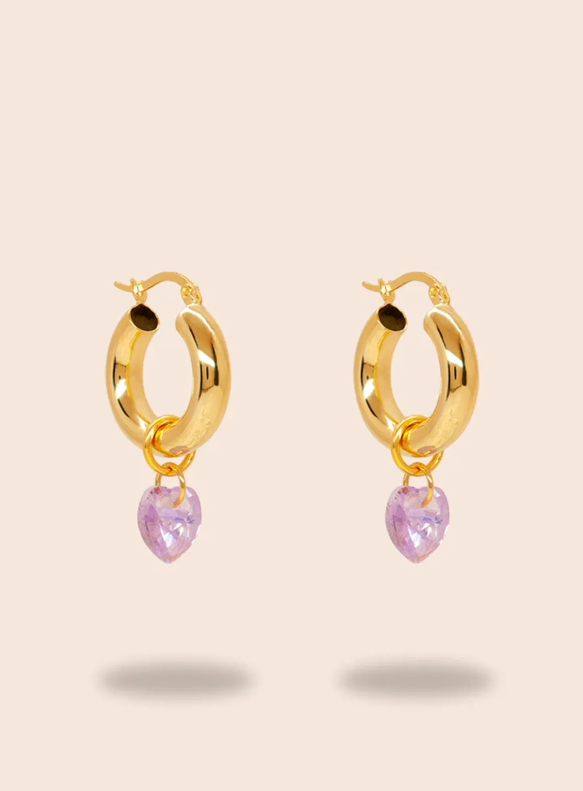 Let’s be lonely together! Lonely Hearts Club -korvakoruissa on 18k kullalla päällystetyt 925 sterling -hopearenkaat ja violetin värinen lasikristallisydän.