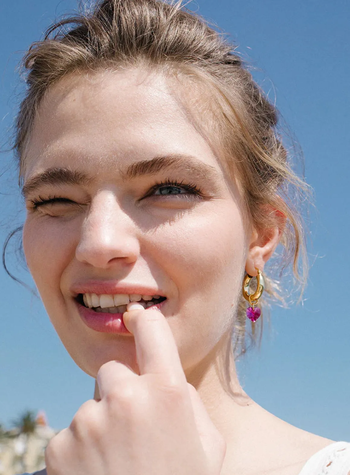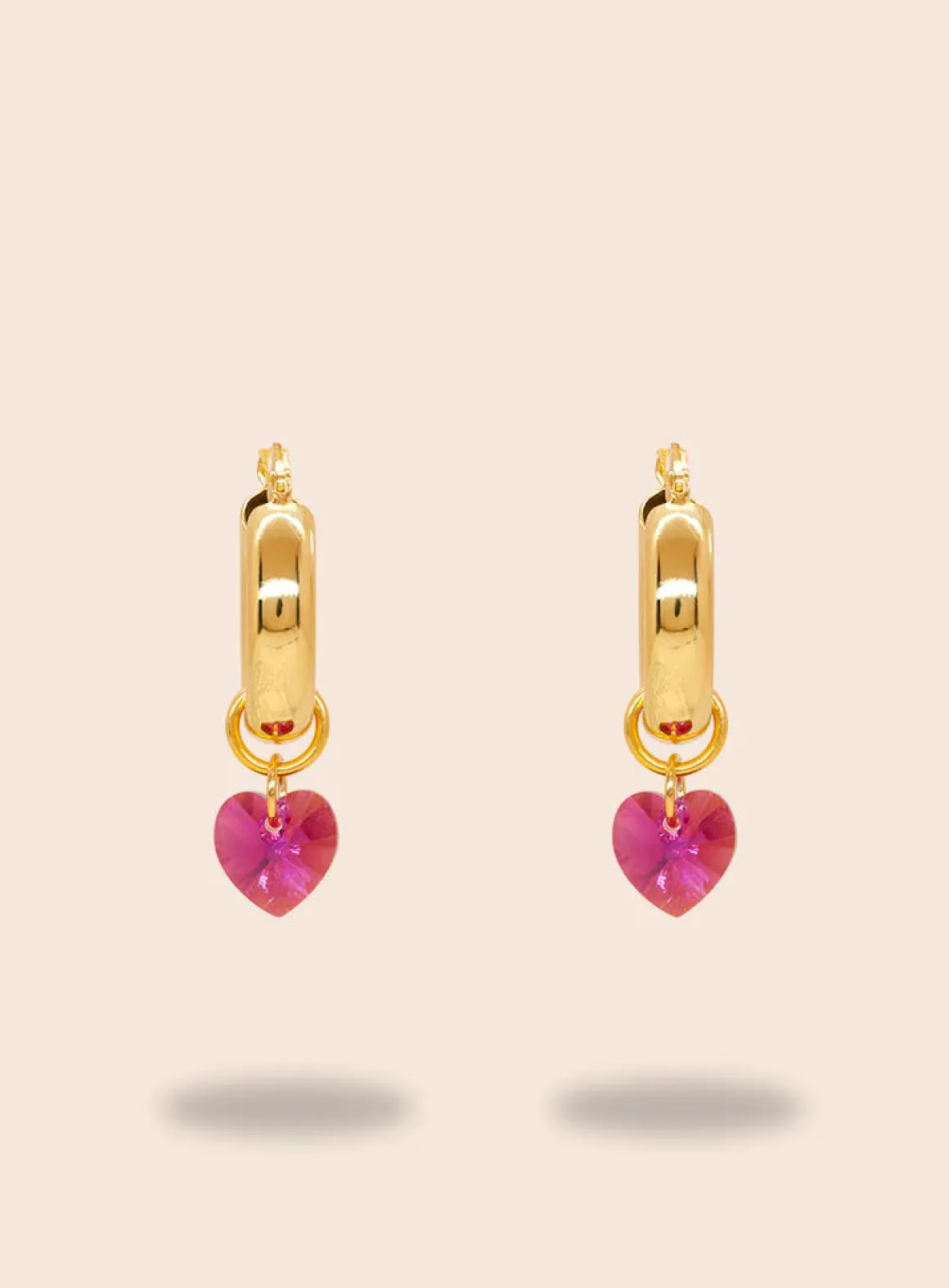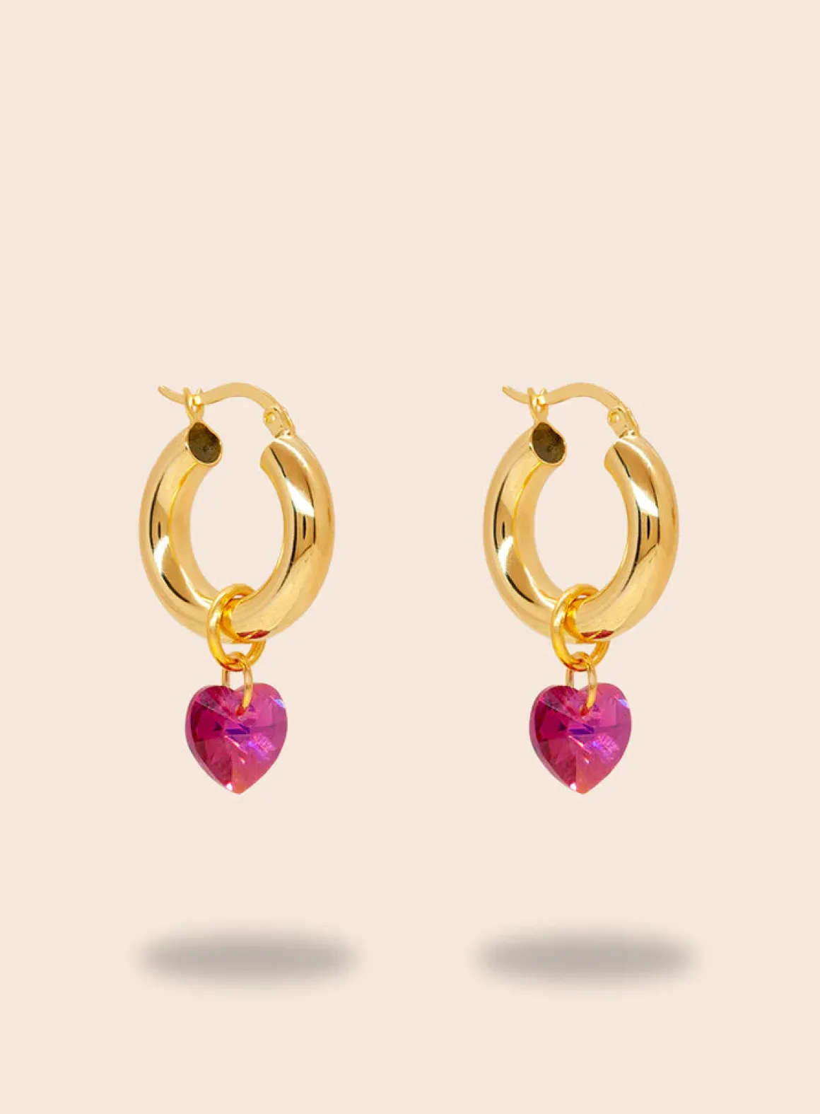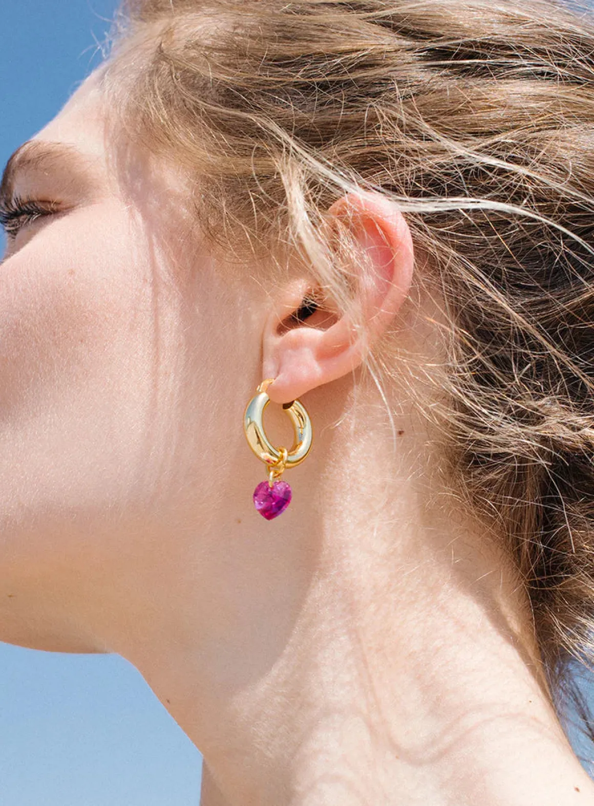 Let’s be lonely together! Lonely Hearts Club -korvakoruissa on 18k kullalla päällystetyt 925 sterling-hopearenkaat ja pinkin värinen lasikristallisydän.