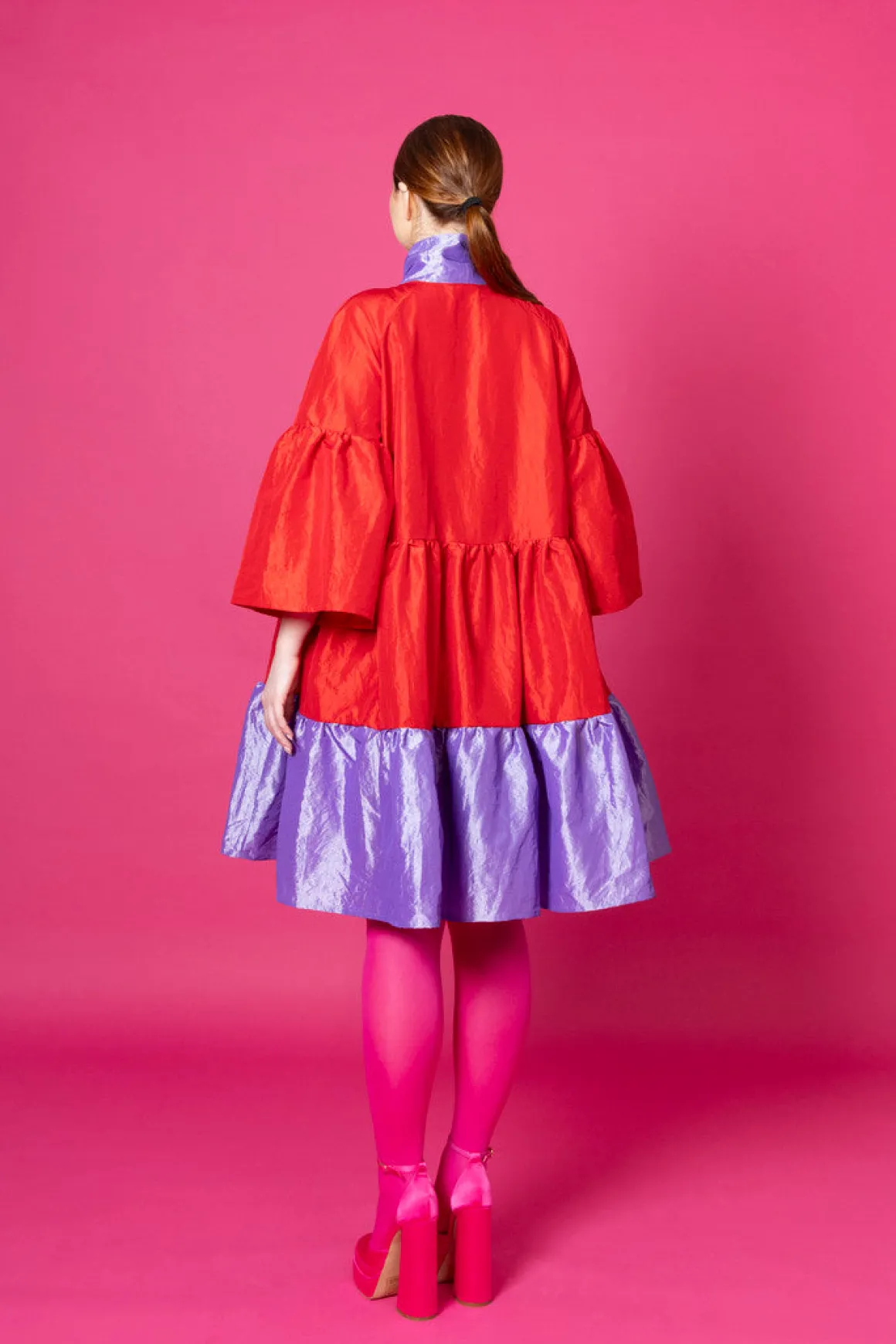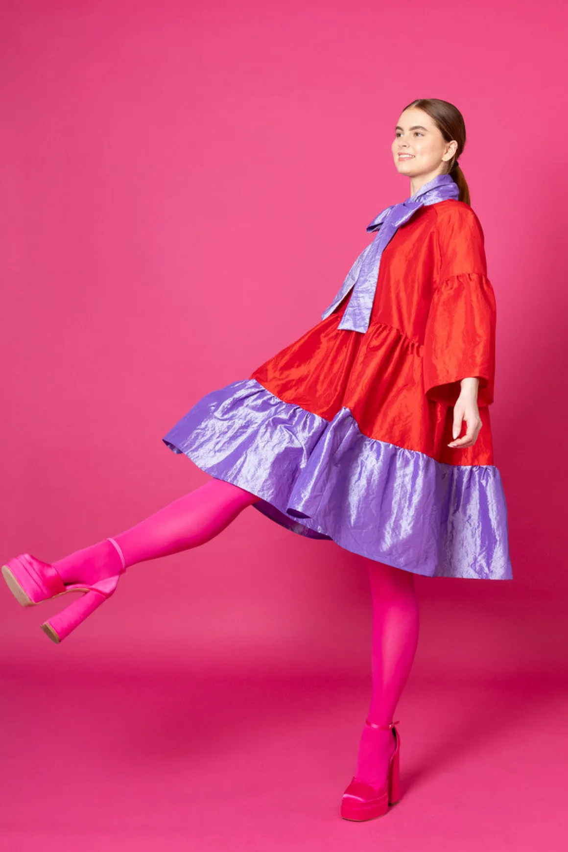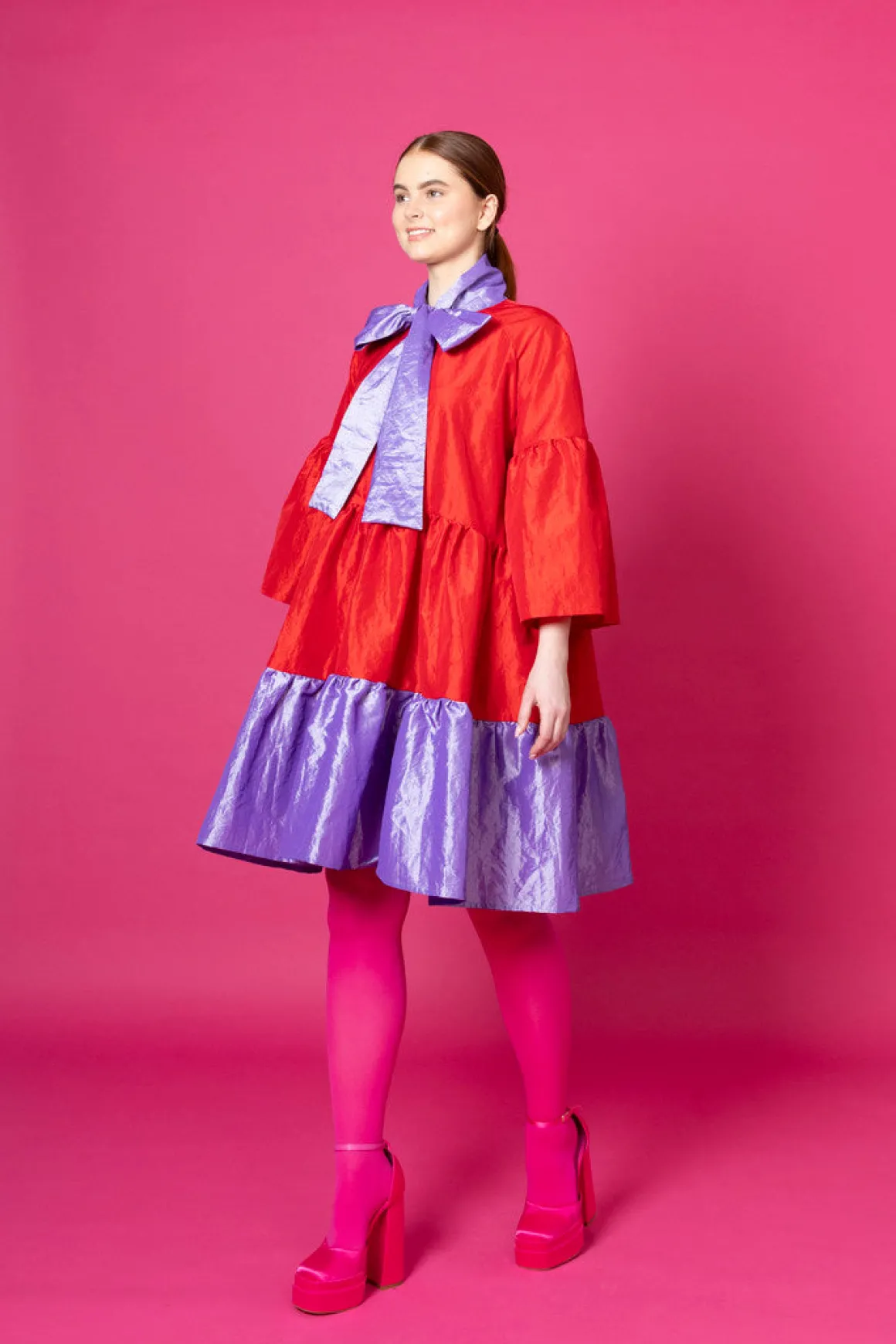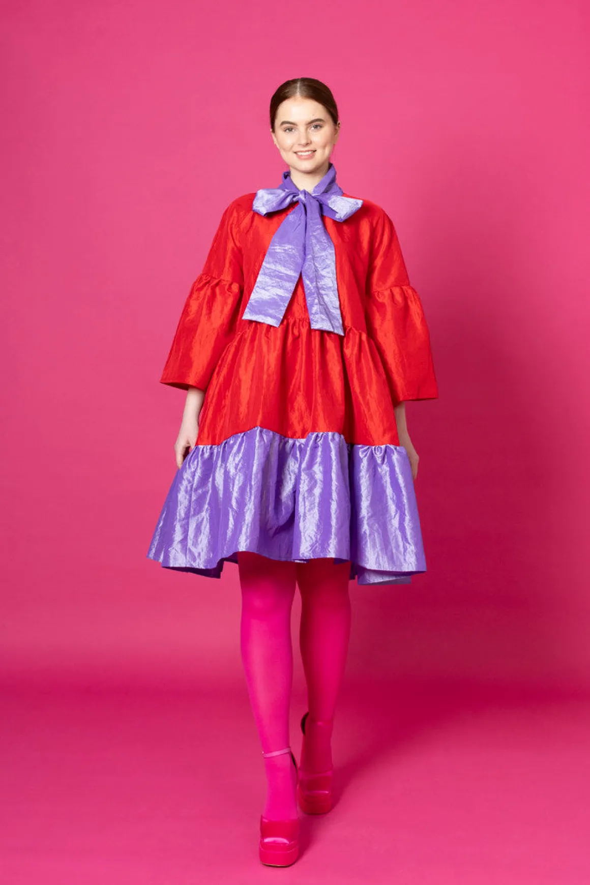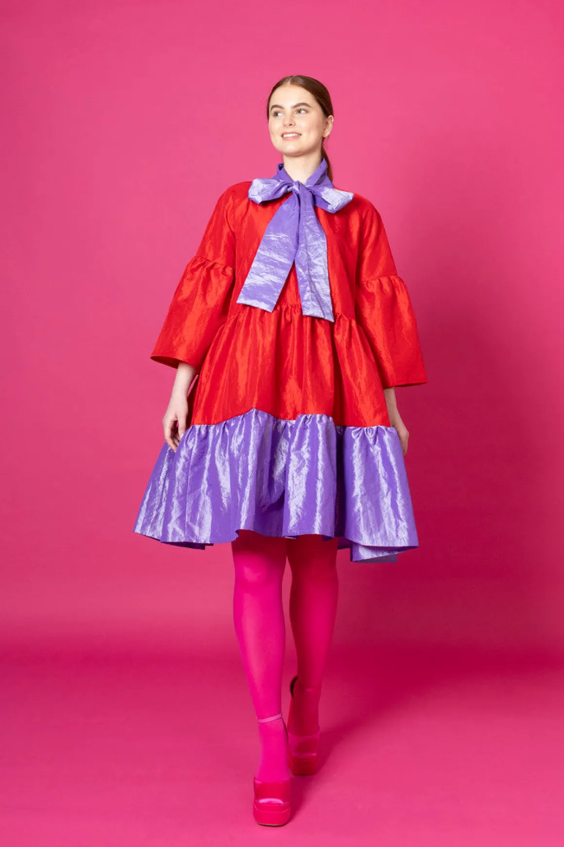 Runsashelmainen Lush- mekko sopii hyvin juhliin. Huivikauluksen voi solmia kauniiksi rusetiksi kaulalle tai kietoa rennosti solmulle. Lush- mekko on istuvuudeltaan väljä ja sen helmassa on runsas röyhelöleikkaus. Mekko laskeutuu kauniista, mutta pitää runsaan muotonsa. Lush- mekko on polvipituinen. Mekossa on ¾ pitkät väljät hihat.