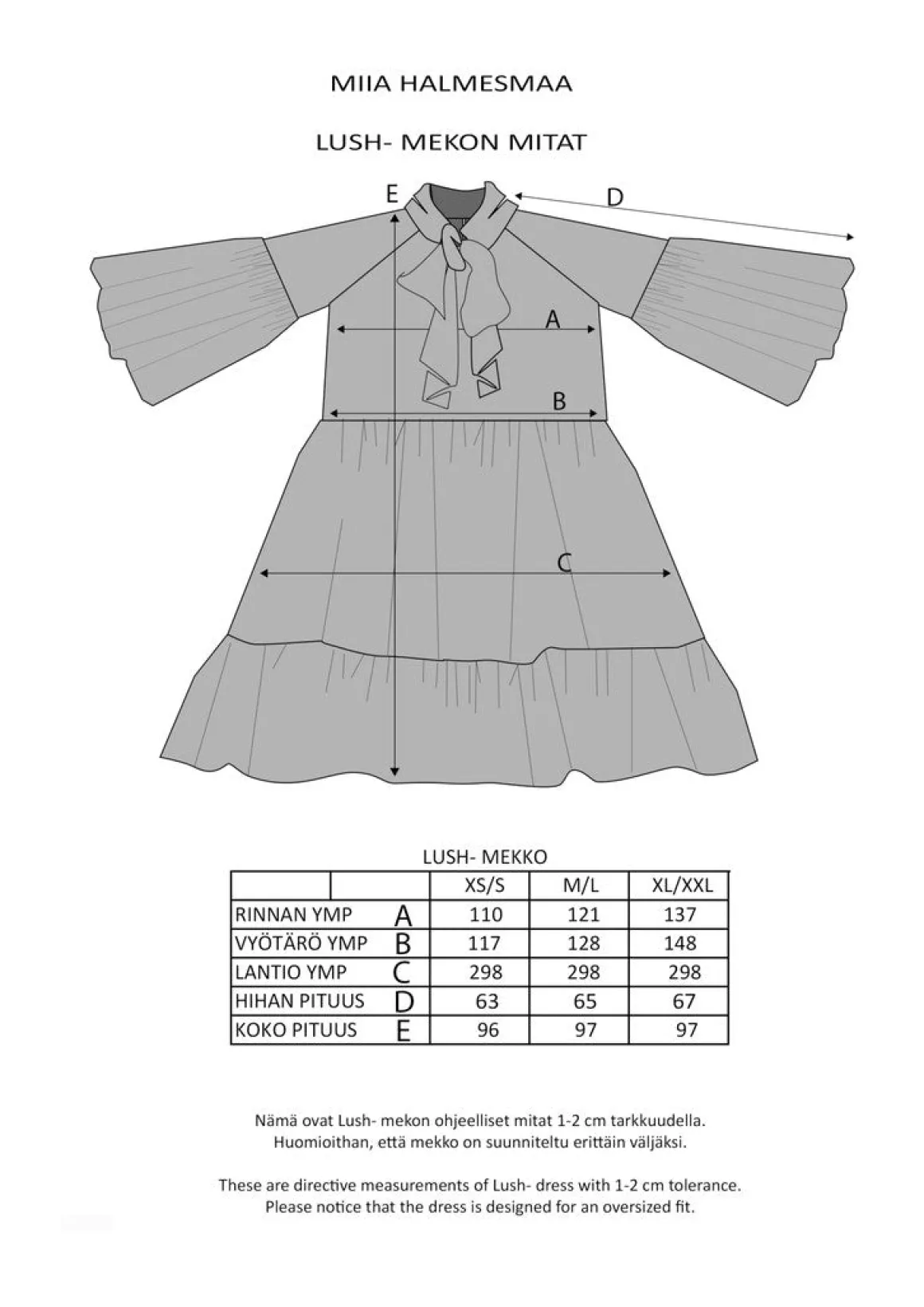 • Malli on 175 cm pitkä ja hänellä on päällään koko M/L