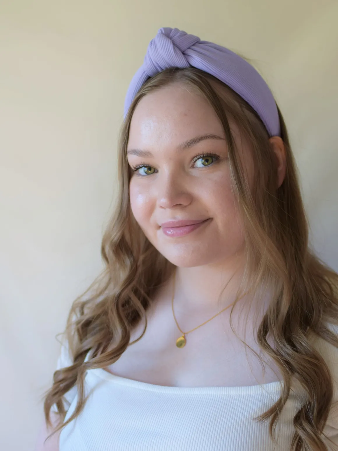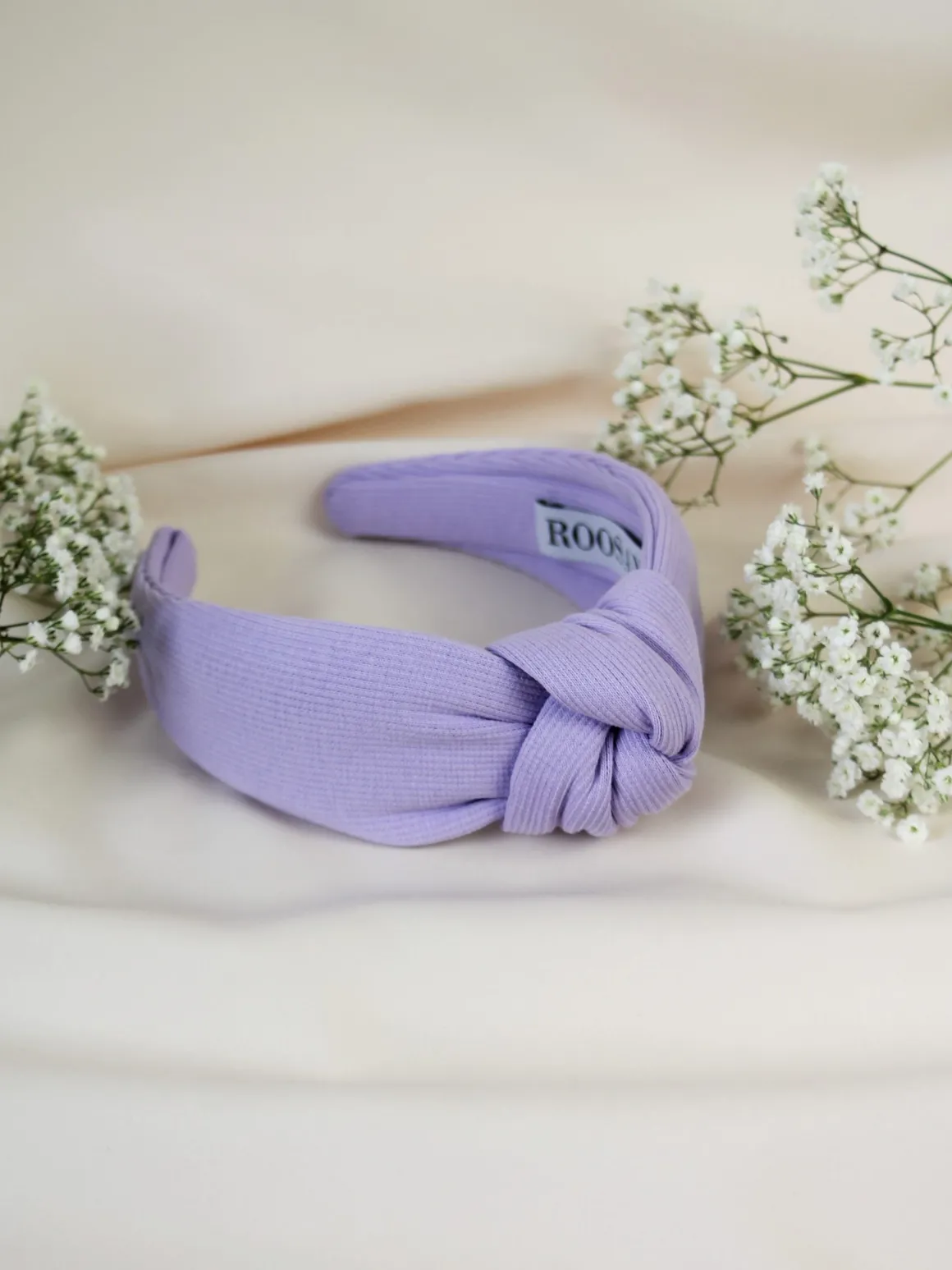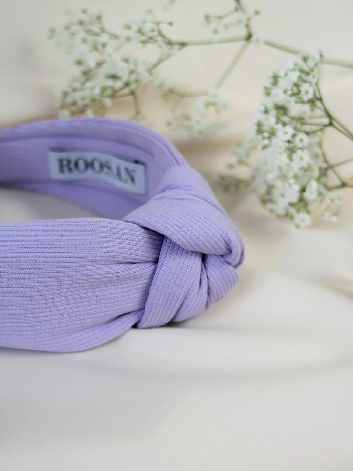 Laadukas laventelin sävyinen hiuspanta, jossa solmu pääliosassa. Kangas on pehmeää ribbitrikoota, 97 % puuvillaa ja 3 % elastaania.