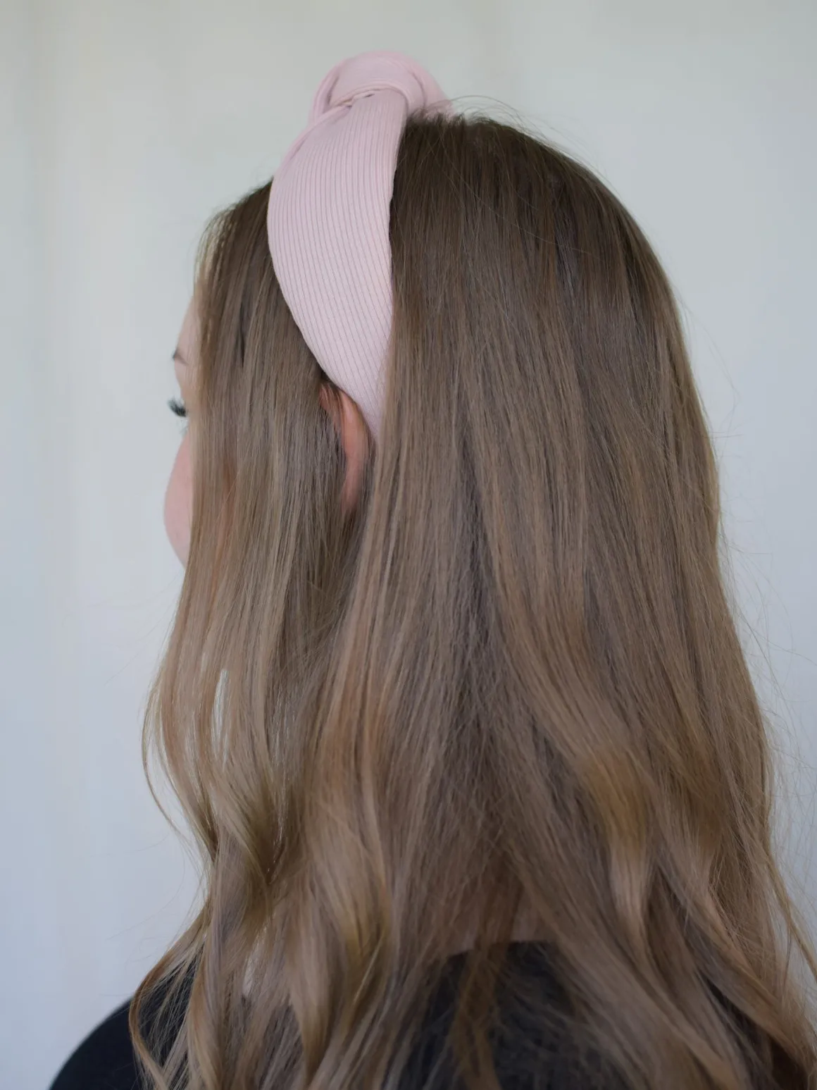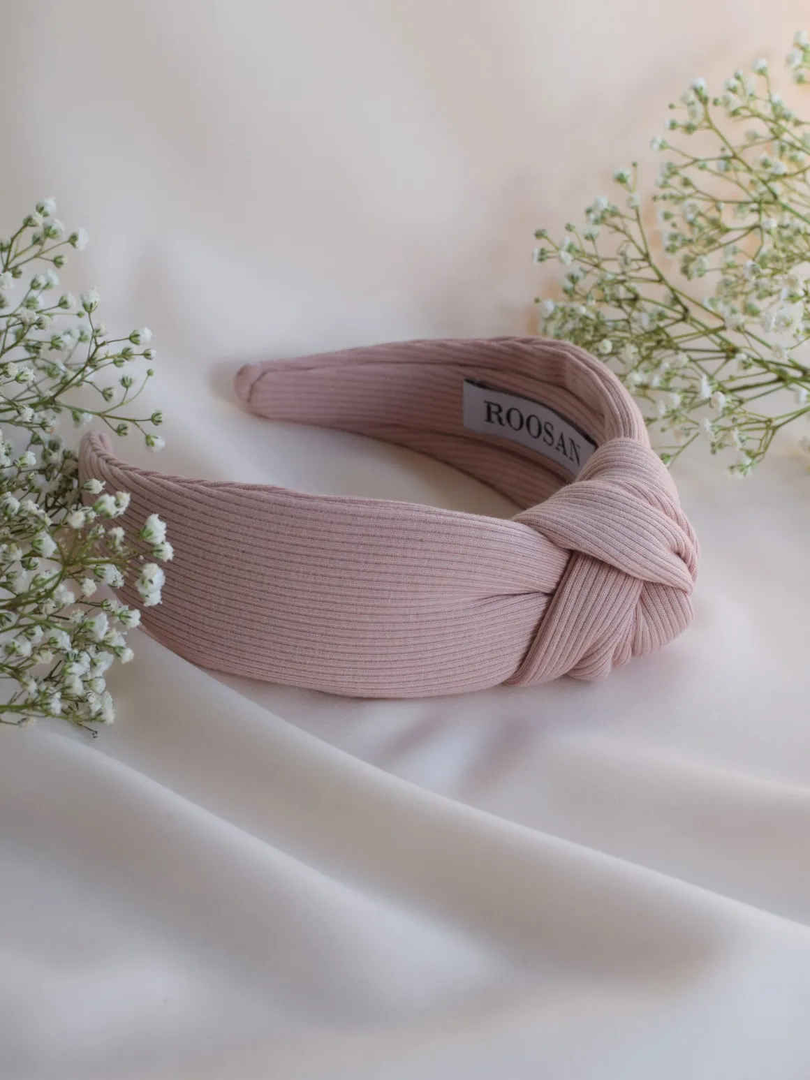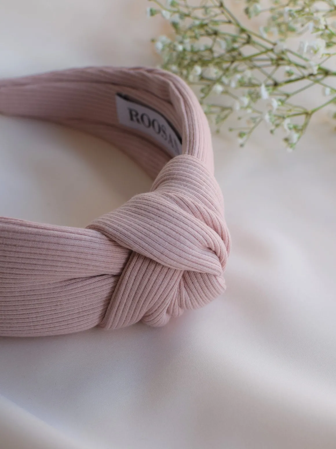 Laadukas vaaleanpunainen hiuspanta, jossa solmu pääliosassa. Kangas on pehmeää ribbitrikoota, 94% puuvillaa ja 6% elastaania.