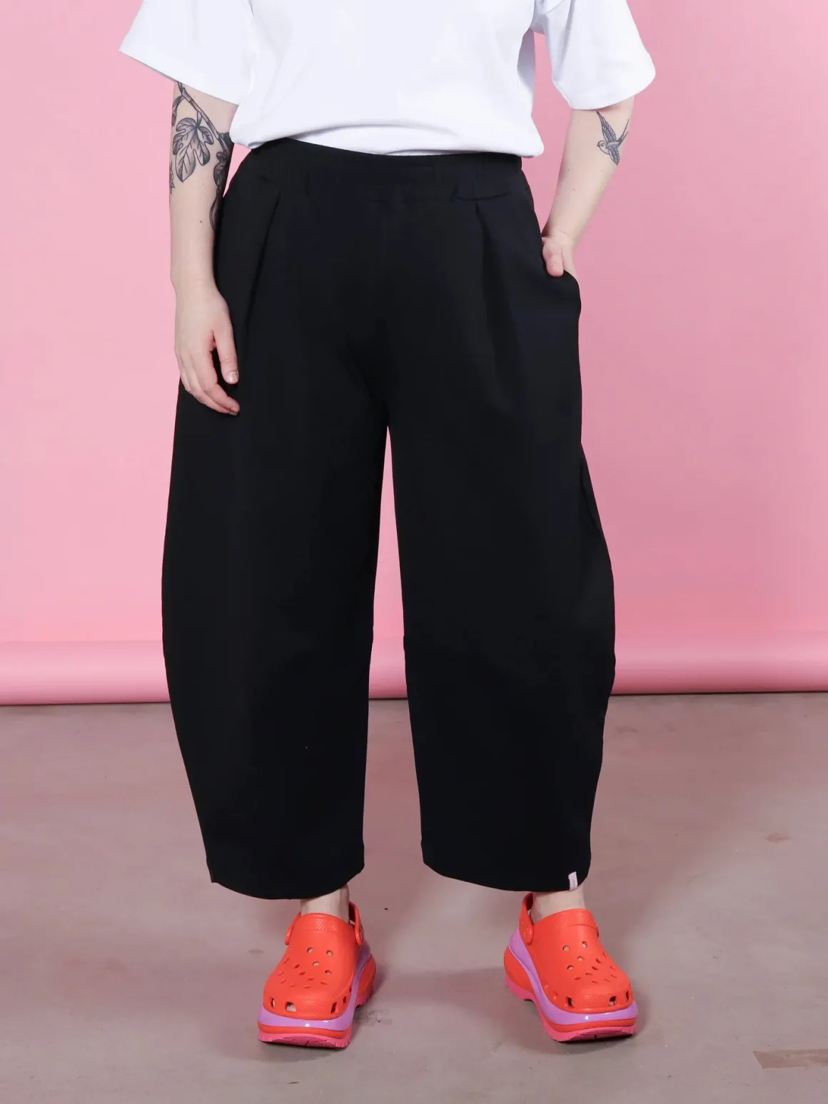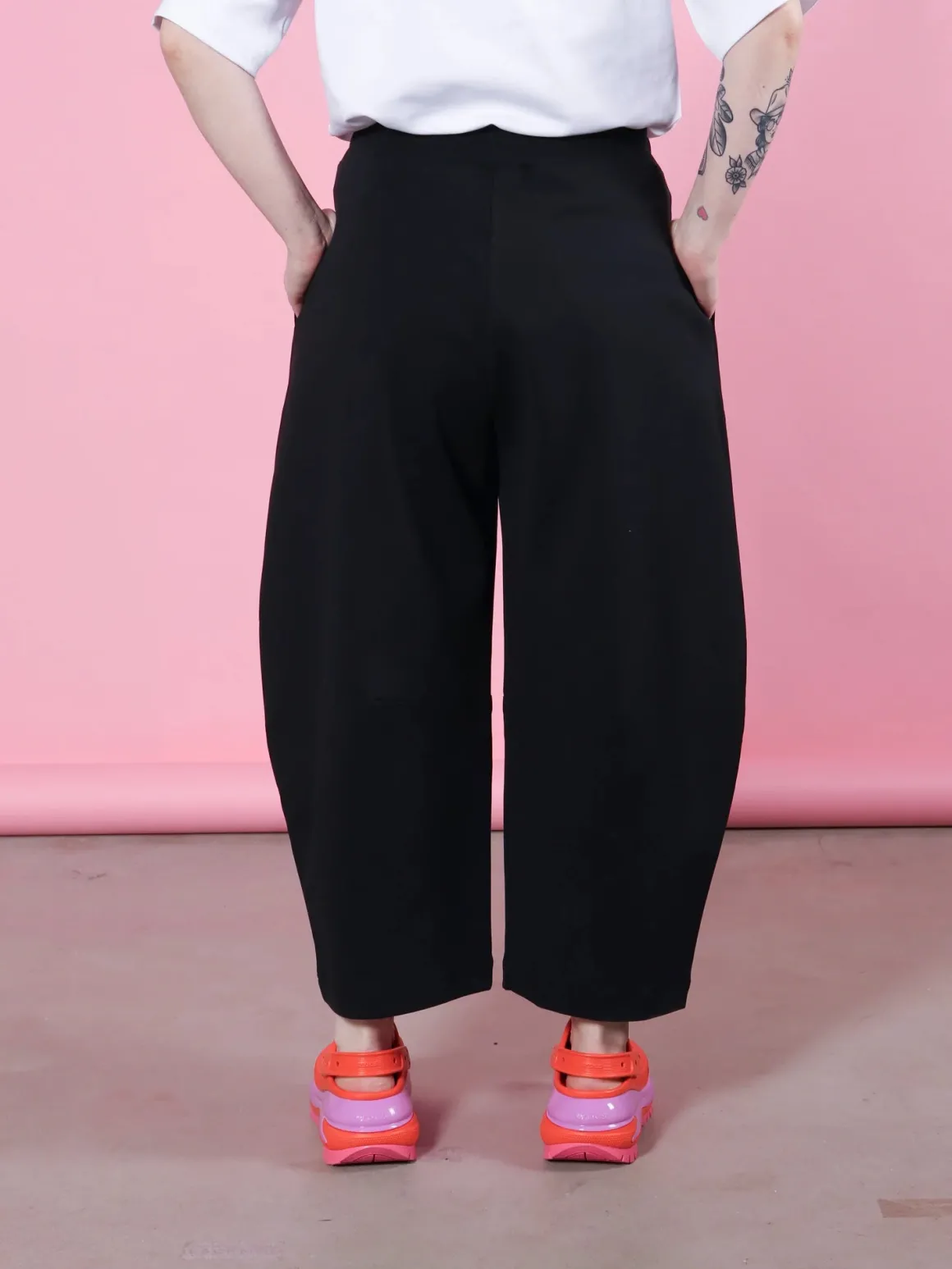 Rennot balloon -malliset housut ovat mukavat käyttää, mutta sopivat myös siistiin asukokonaisuuteen. Housuissa on myös taskut. Trikoota paksumpi Ponto Roma interlock -materiaali tekee housuista pukevammat. Muotolaskokset polvissa ja lahkeissa. Hieman vajaamittaiset lahkeet, kuminauha vyötäröllä.