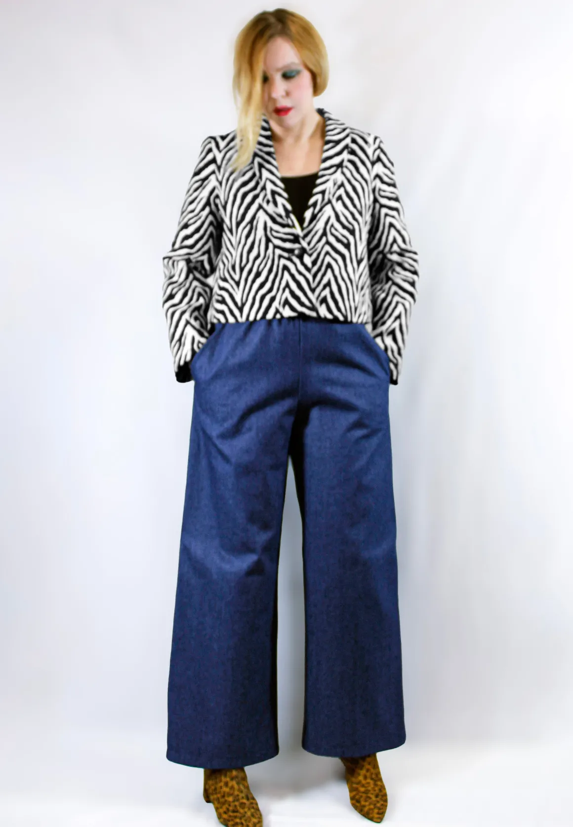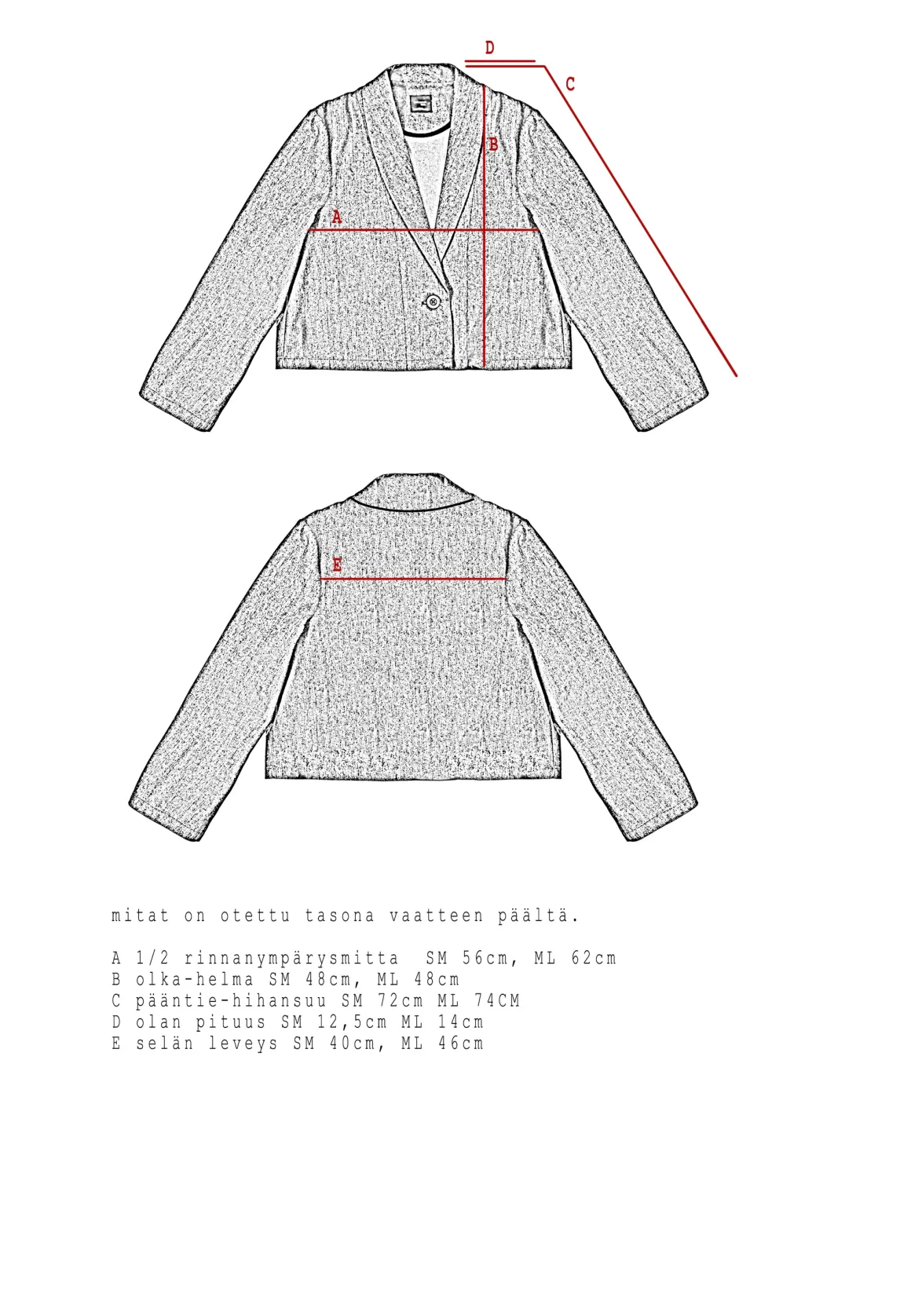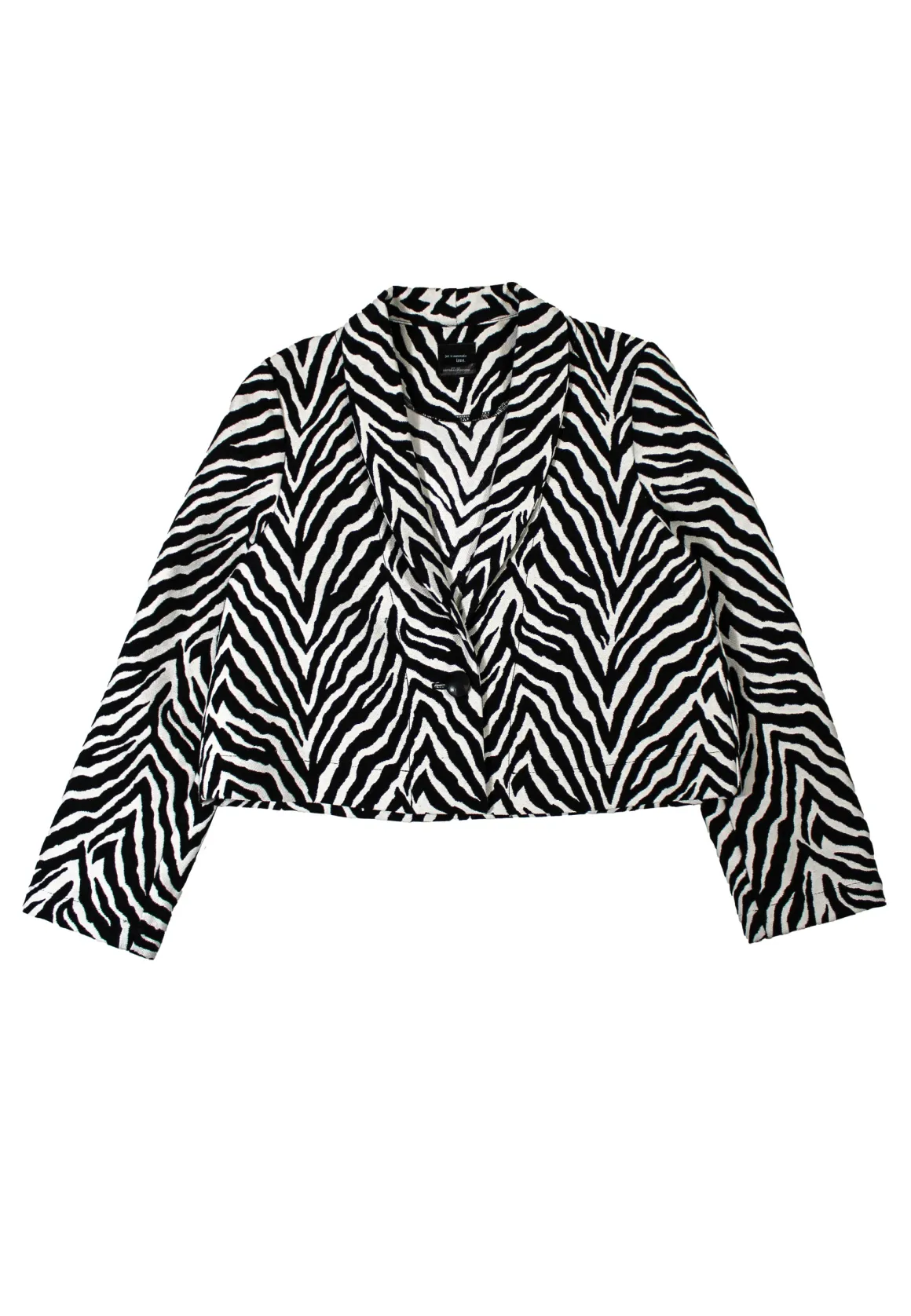 Lyhyt laatikkomallinen seeprakuvioinen takki. Edessä on nappikiinnitys. Hihat on istutettu joten tarkista mitoista selän leveysmitta ja olan pituusmitta. Takissa ei ole taskuja.