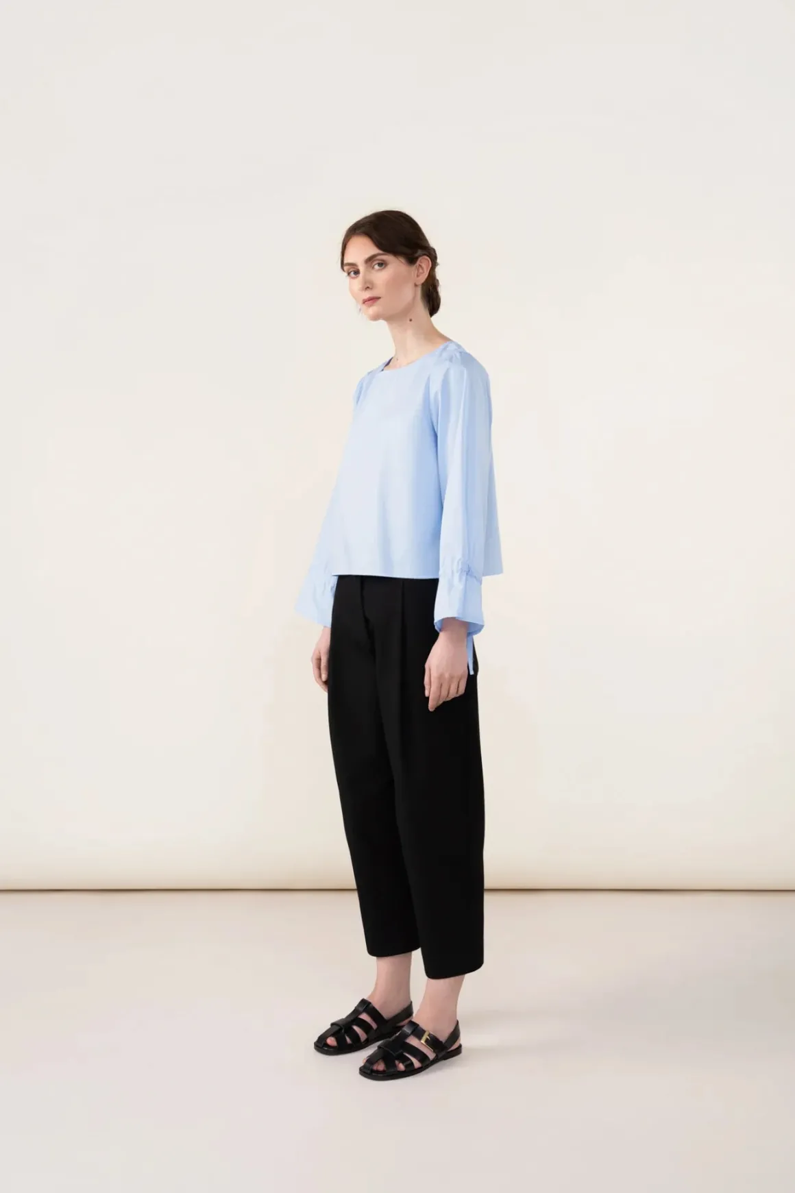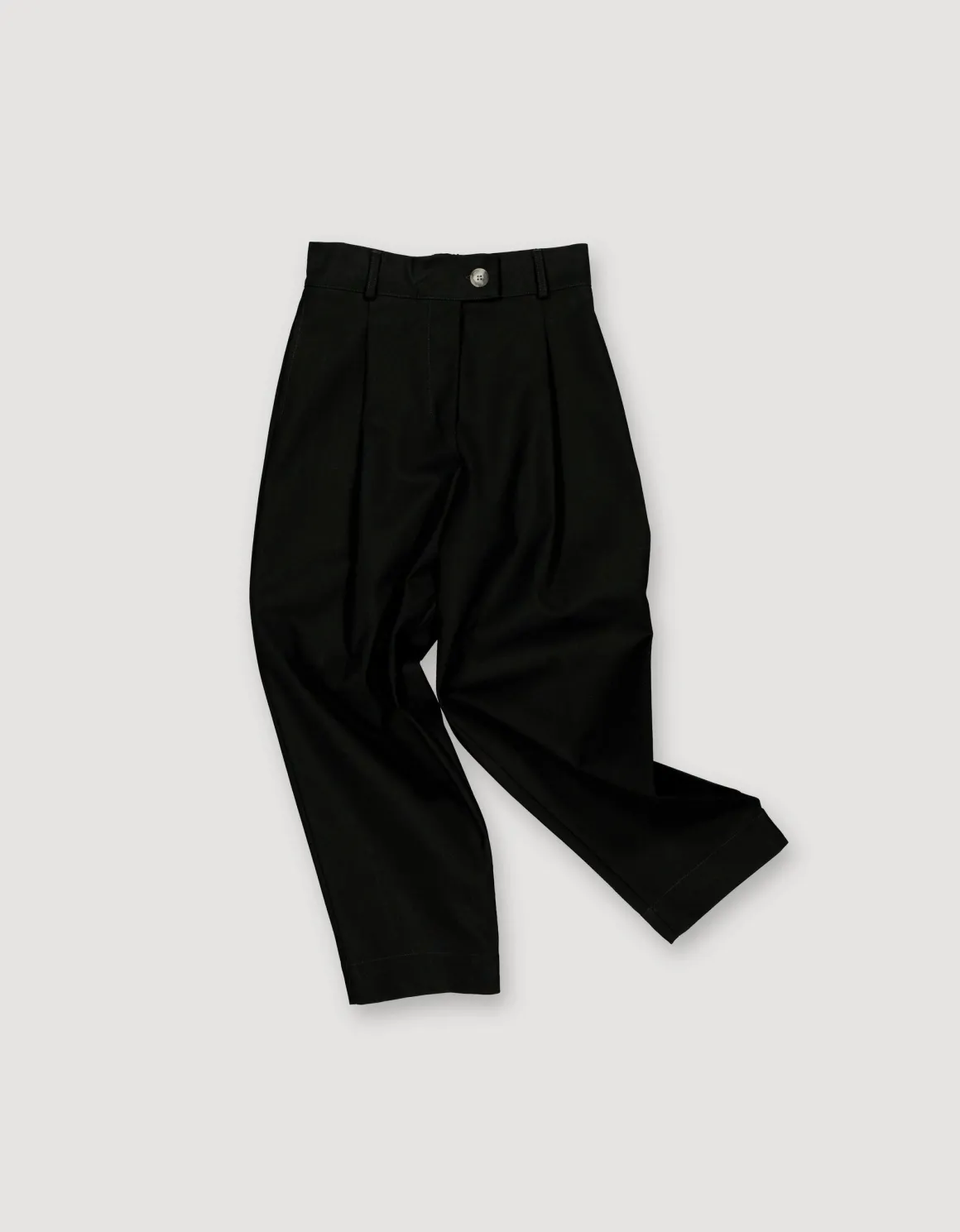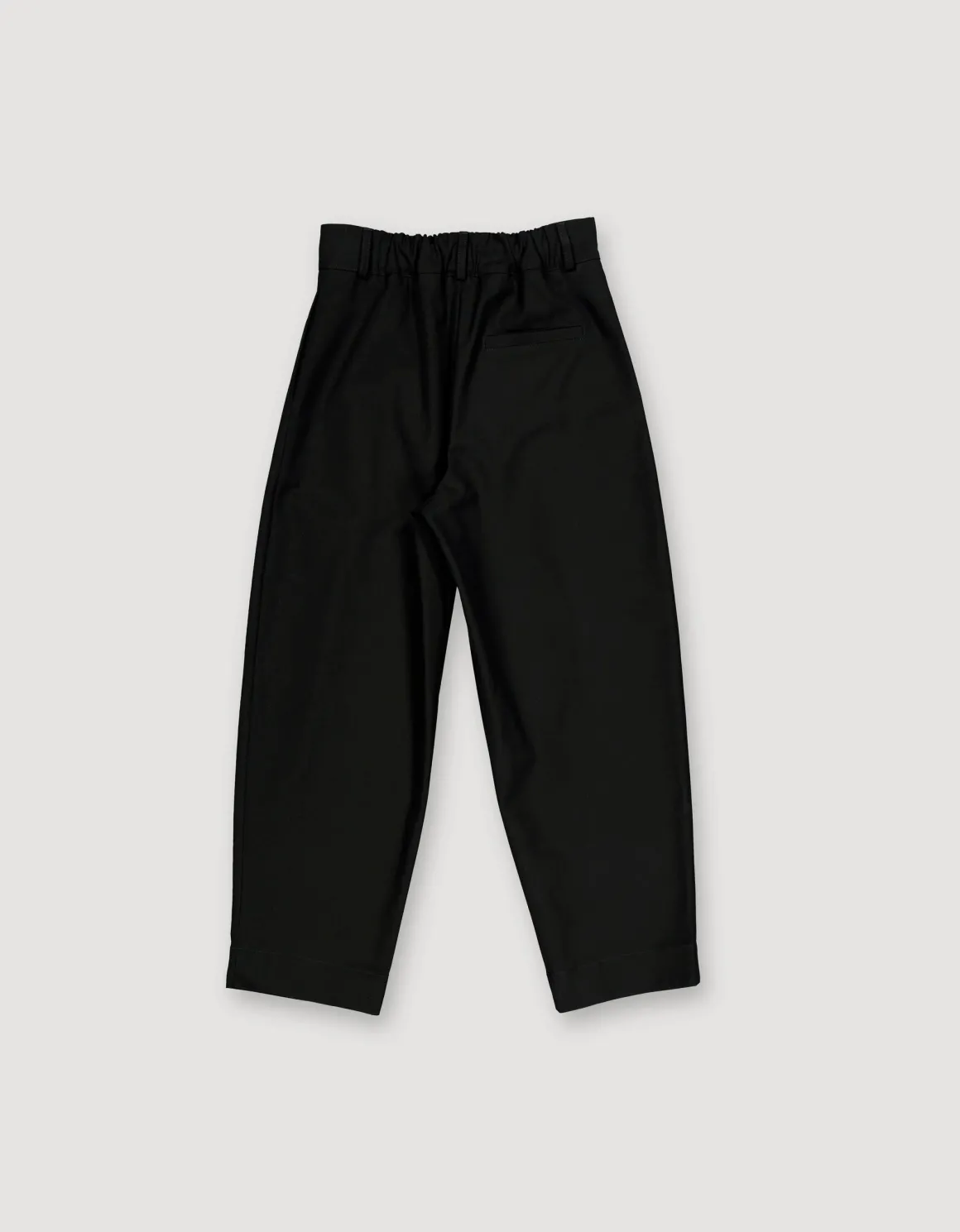 The pleated black trousers are crafted from crisp Japanese cotton canvas.The high waist trousers feature side pockets, one back welt pocket and belt loops, a zipper fastening with a horn imitation button from biodegradable resin. The elastic waist band at the back adds to comfort.