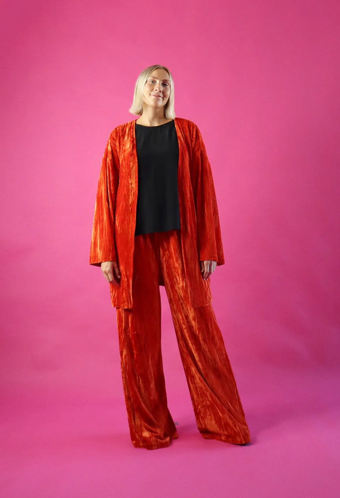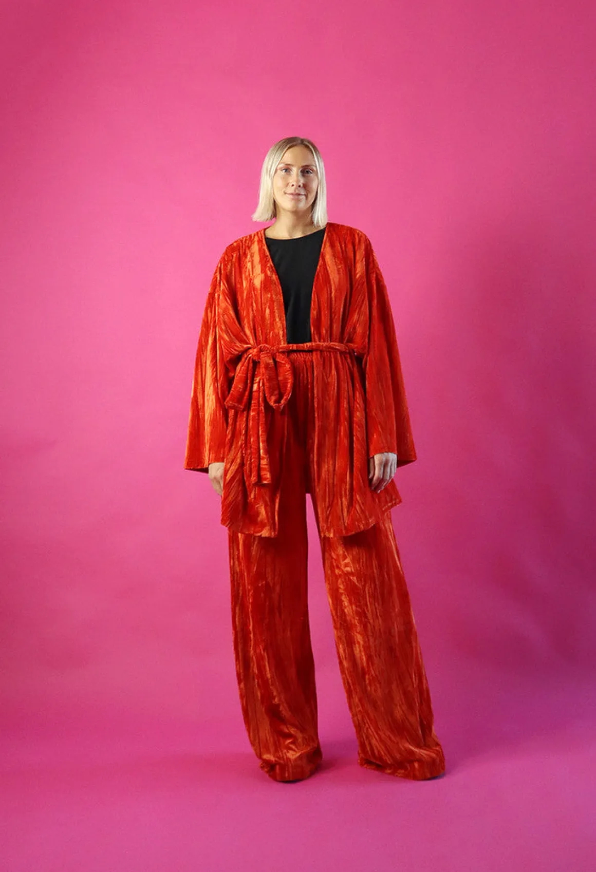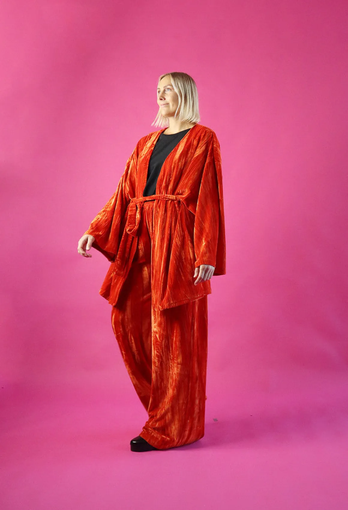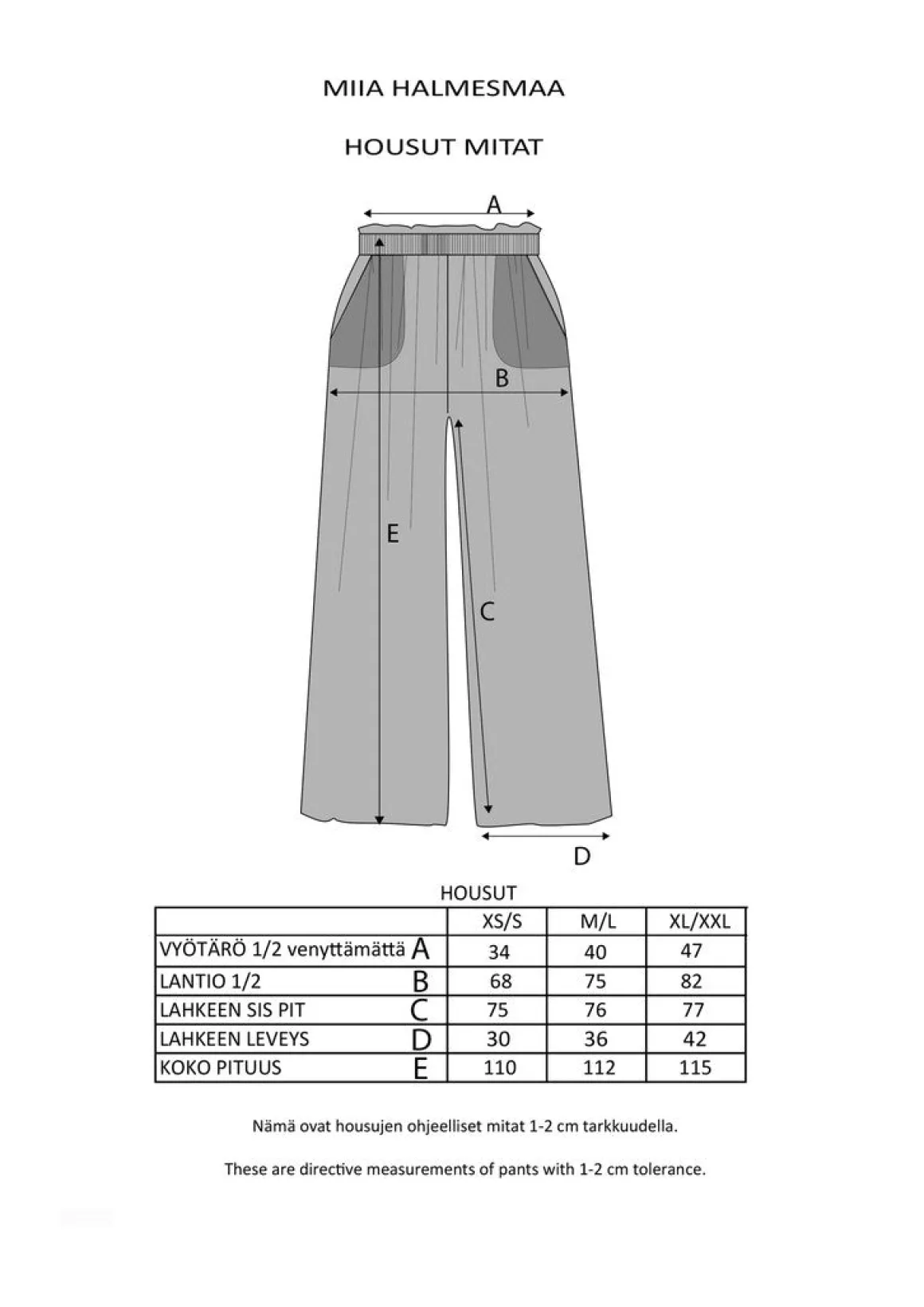 Leveä lahkeiset housut ovat istuvuudeltaan väljät. Housut laskeutuvat kauniisti ja sivusaumoissa on taskut. Vyötäröllä on kuminauha.