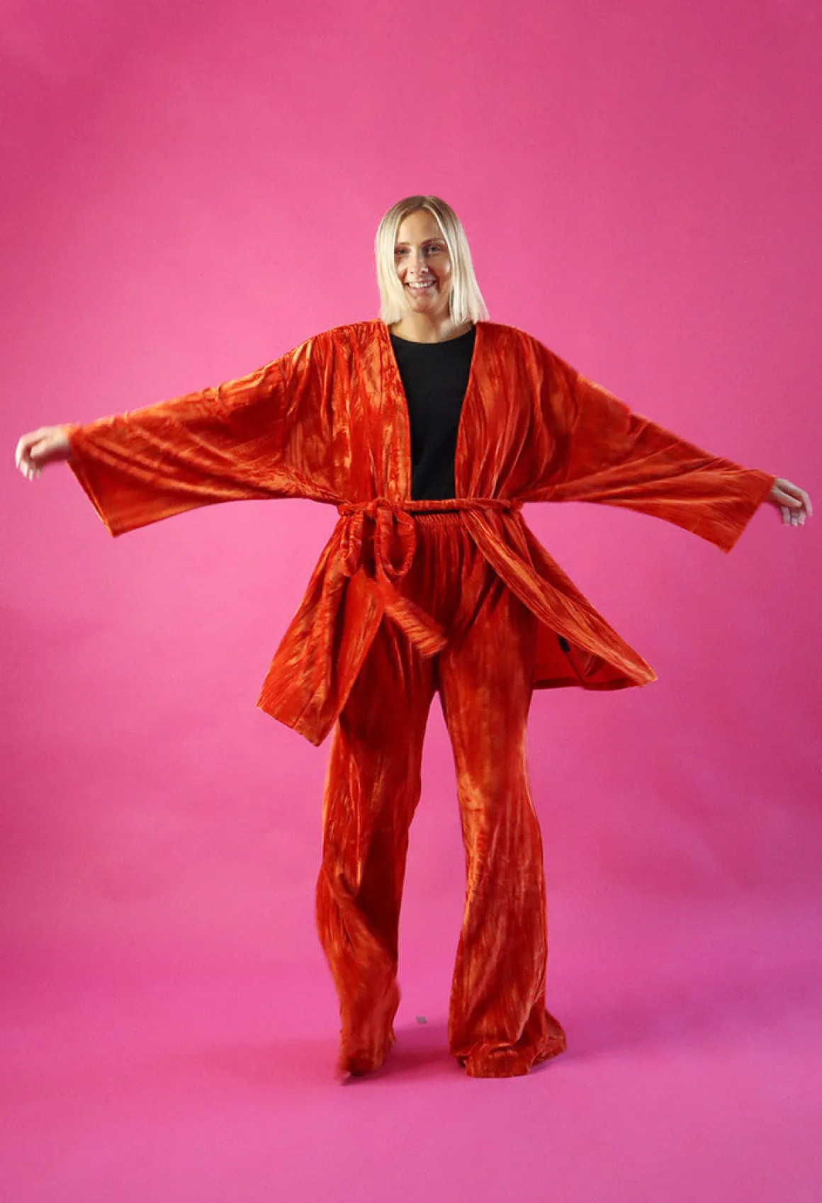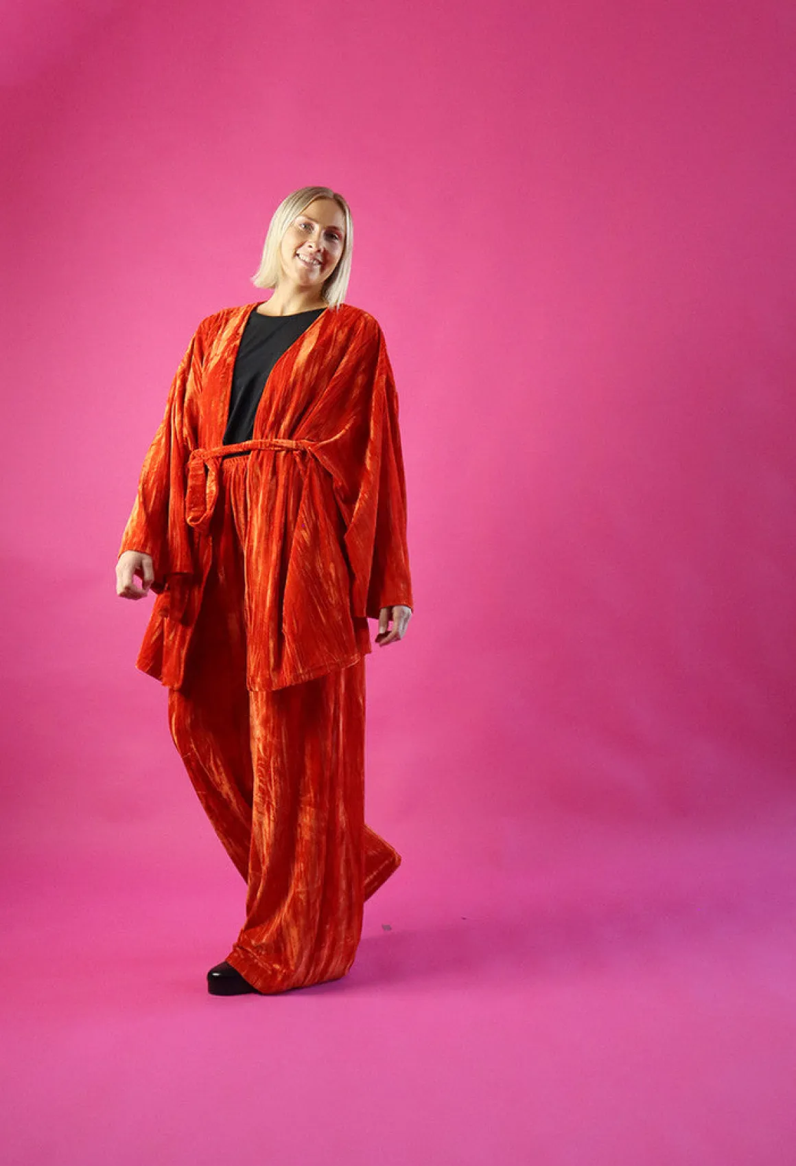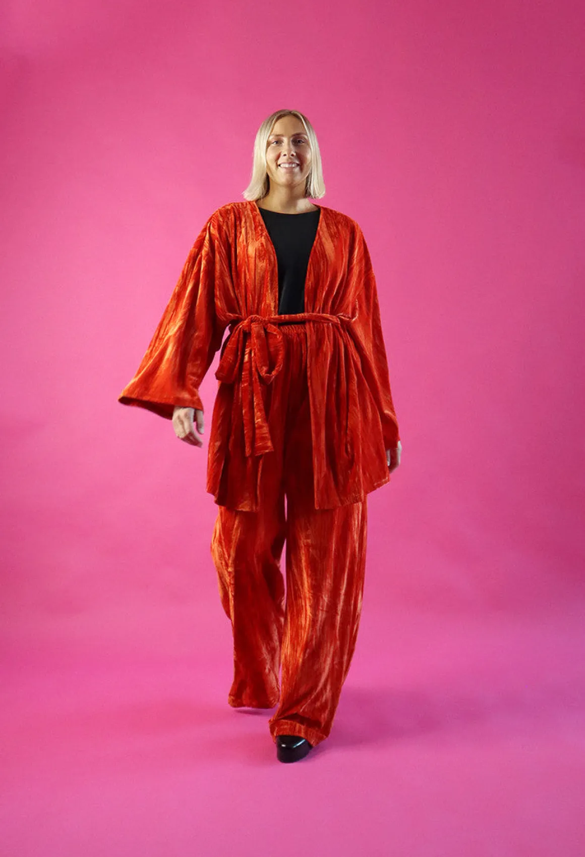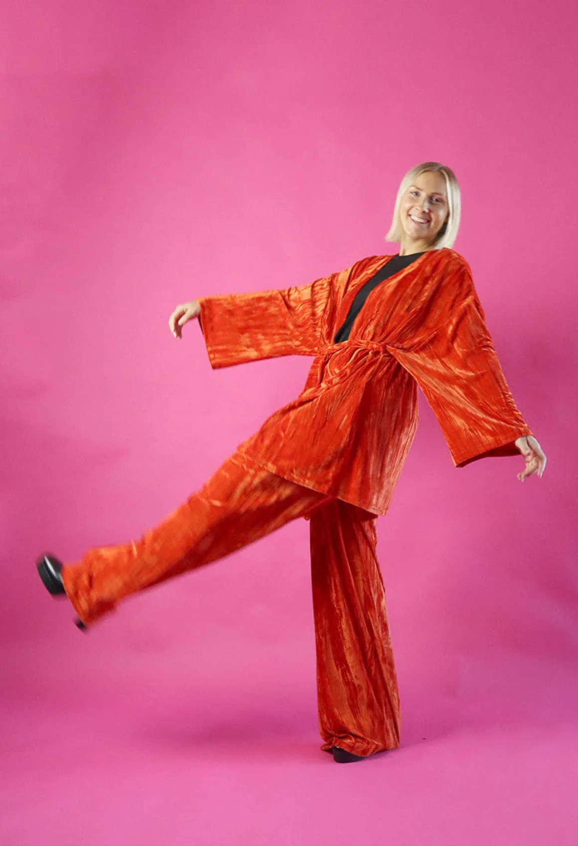 Leveä lahkeiset housut ovat istuvuudeltaan väljät. Housut laskeutuvat kauniisti ja sivusaumoissa on taskut. Vyötäröllä on kuminauha.