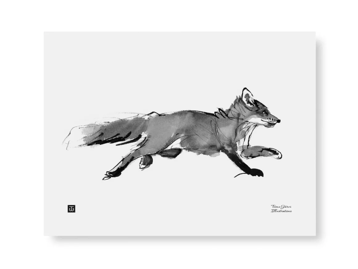 Taidegrafiikkana suosittu Seikkaileva kettu on nyt saatavilla myös julisteena. Mustavalkoisessa taidejulisteessa kettu on vauhdissa! Seikkaileva kettu -juliste on painettu luonnovalkoiselle, korkealaatuiselle FSC-sertifioidulle mattapaperille. Tuotteella on suomalaisen työn Avainlippu-merkki. Jokainen tuote tarkastetaan käsin, jotta myyntiin menevien tuotteiden laatu on aina ensiluokkainen.
