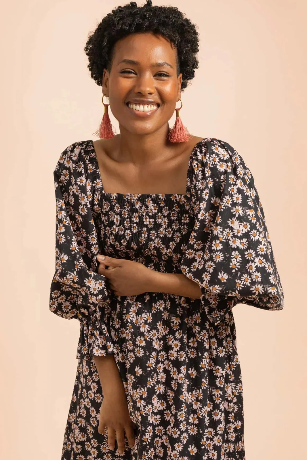 Suuret puhvihihat on suunniteltu monikäyttöisiksi: olalla olevat kuminauhat pitävät hihat tukevasti paikoillaan, ja halutessasi voit luoda off-shoulder-tyylin vetämällä hihat olkapäiltä alas. Vajaamittaisissa hihansuissa on kauniisti poimutetut frilla-yksityiskohdat, ja midimittaista levenevää helmaa koristaa viehättävä frilla. Kuosina ajaton Daisy, jossa päivänkakkarat rönsyilevät mustalla pohjalla.