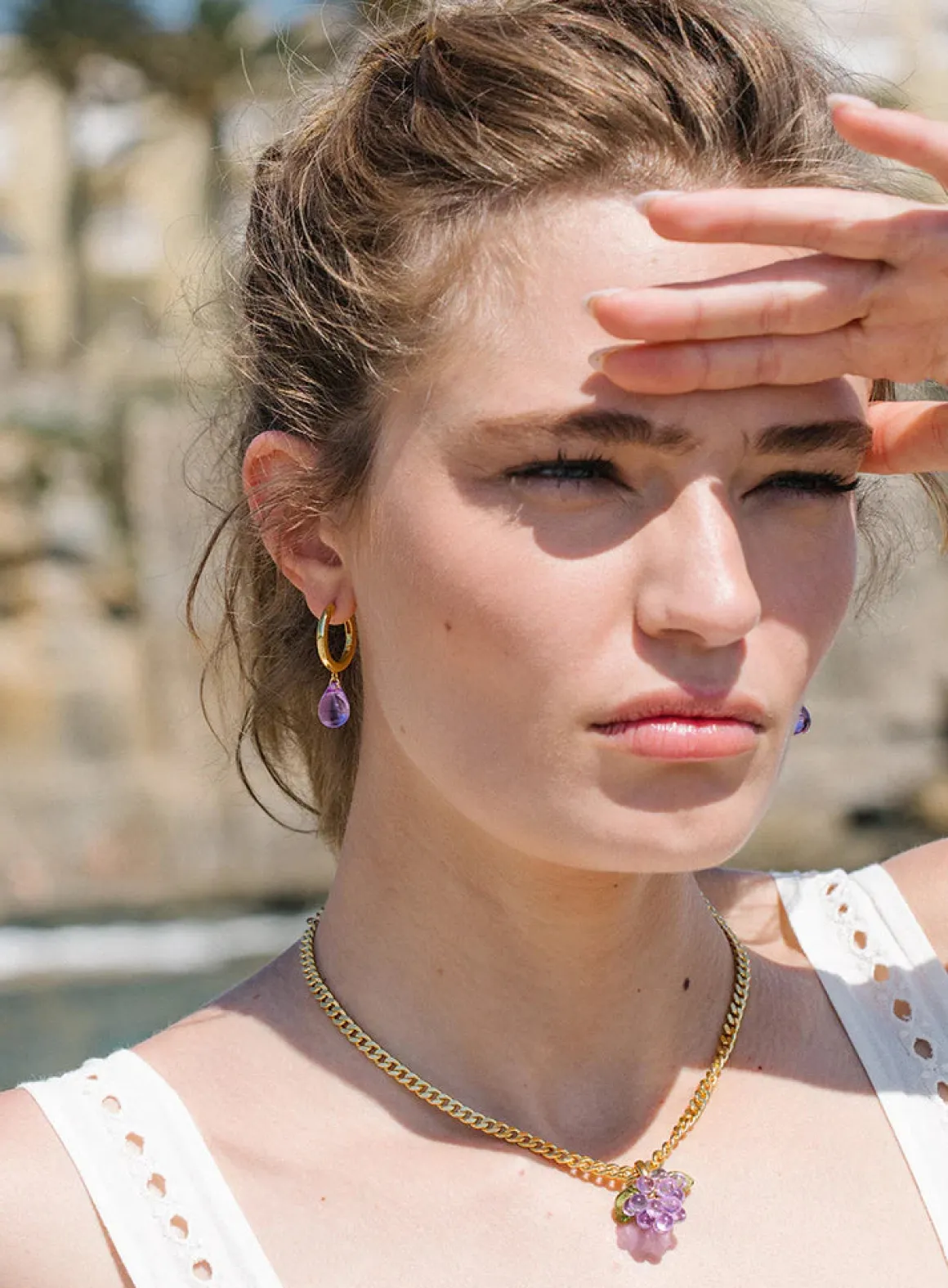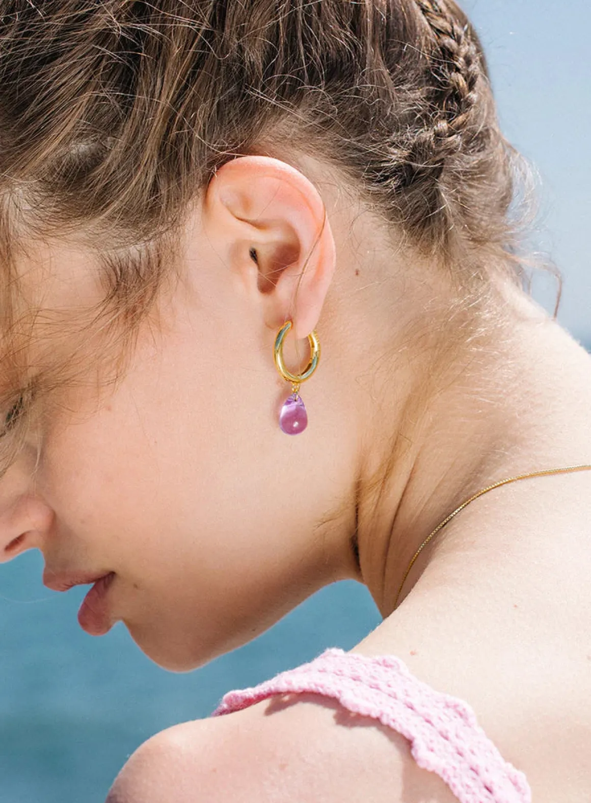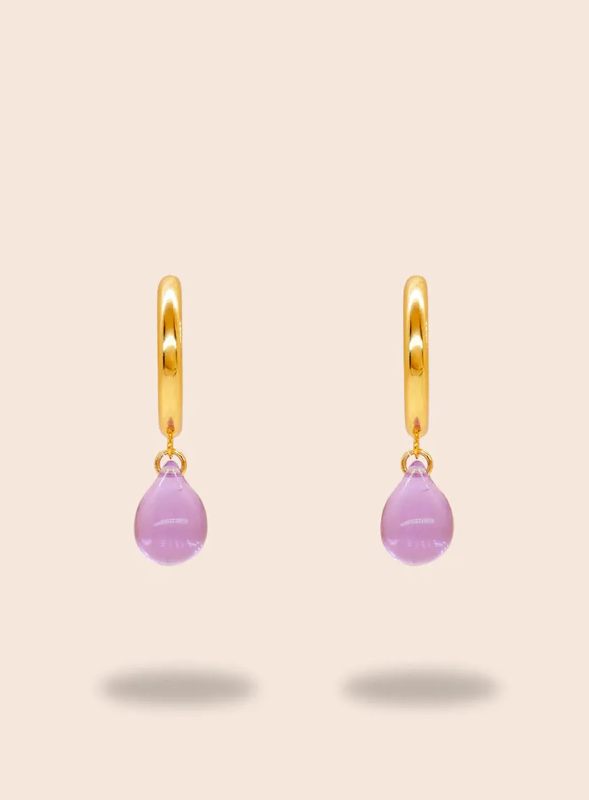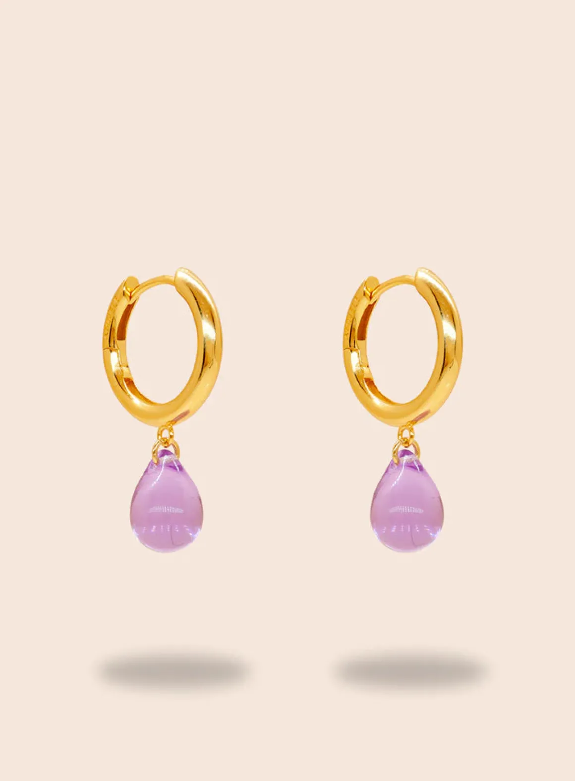 Sugar, spice and everything nice. Sugar Drop -korvakoruissa on 18k kullalla päällystetyt 925 sterling-hopearenkaat ja violetit lasihelmet.