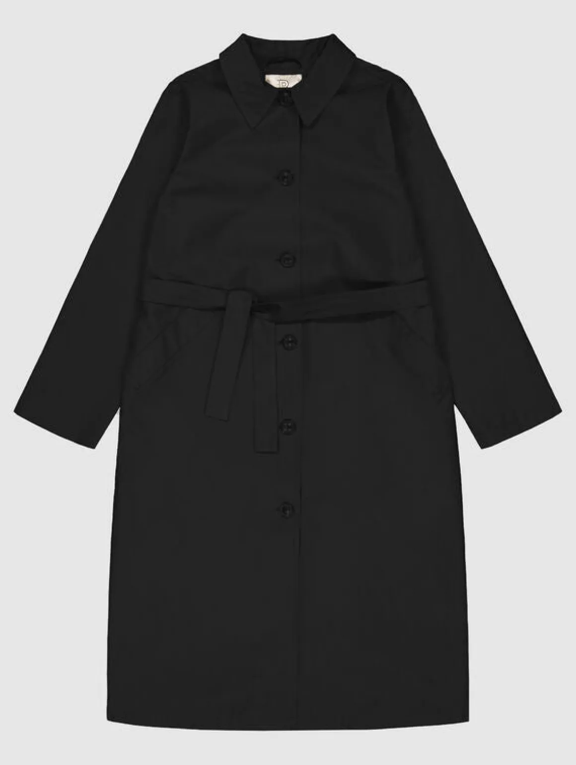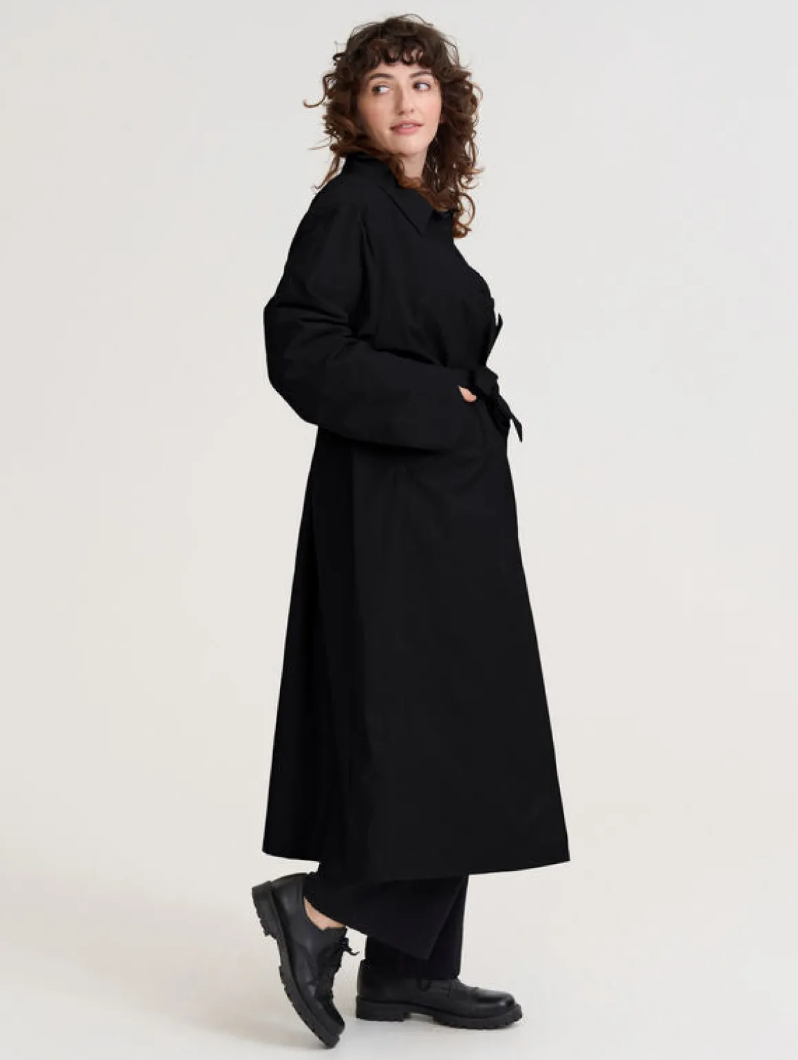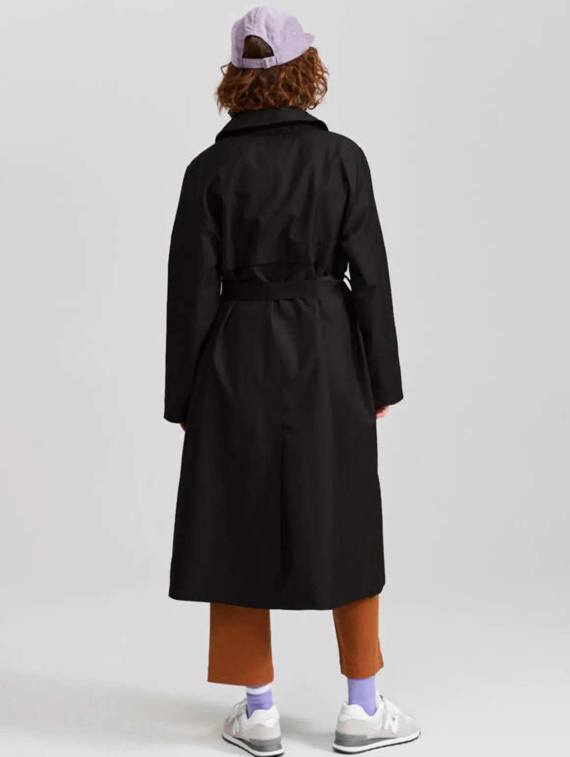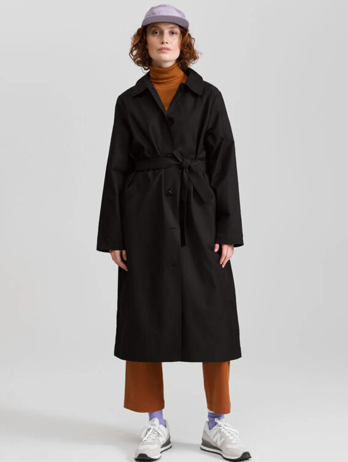Pohjepituinen vuorillinen trenssitakki. Väljä mitoitus. Italiassa valmistettu laadukas puuvillasekoitekangas on vettähylkivä. Kankaan käsittelyssä ei ole käytetty fluorikarbonaattiyhdisteitä, eli tuote on PFC/PFAS-vapaa. Kaulukset, nappikiinnitys ja leveä solmittava irtovyö. Pitkät suorat hihat, hihansuissa kääntövara. Sivutaskut, selässä takakaarroke ja helmassa halkio. Niskassa brodeerattu puu-logo.