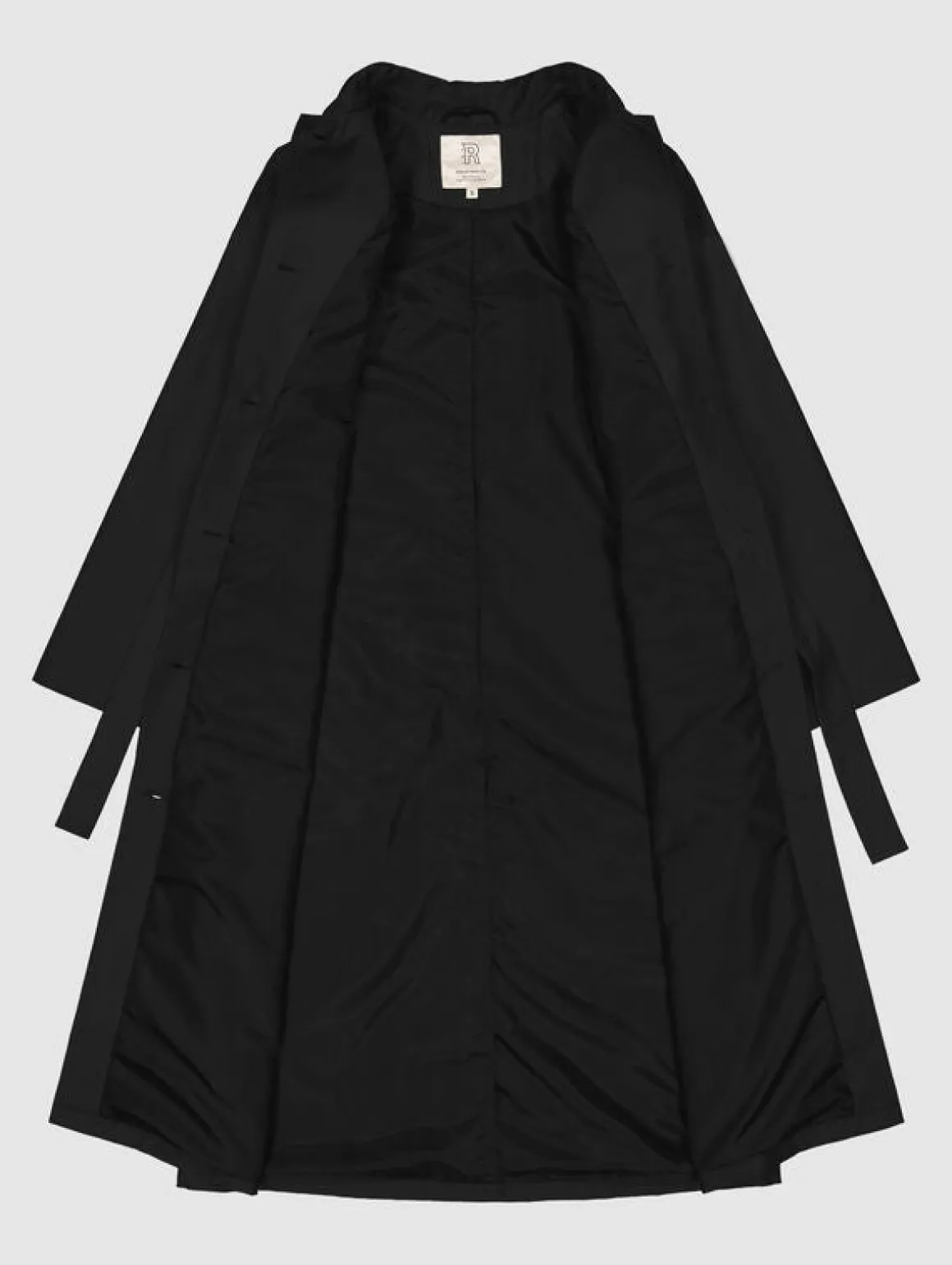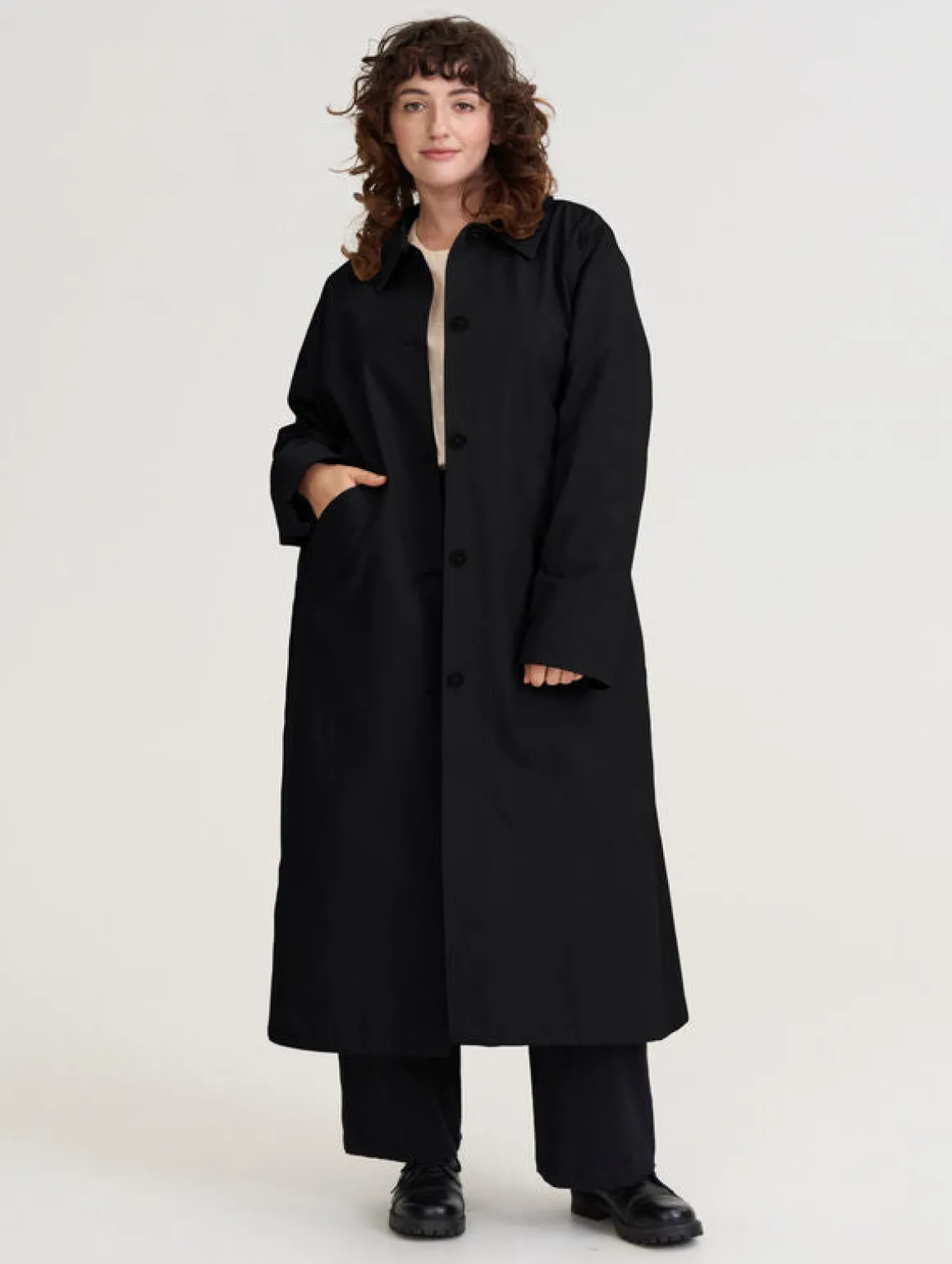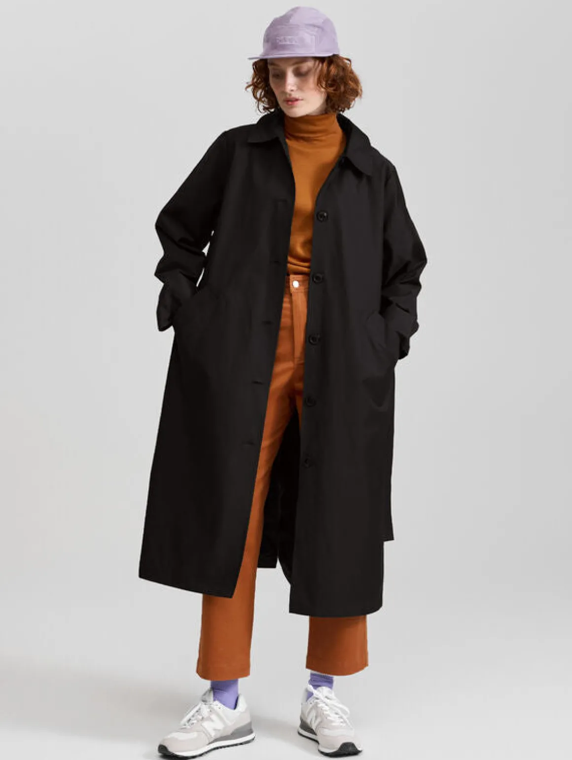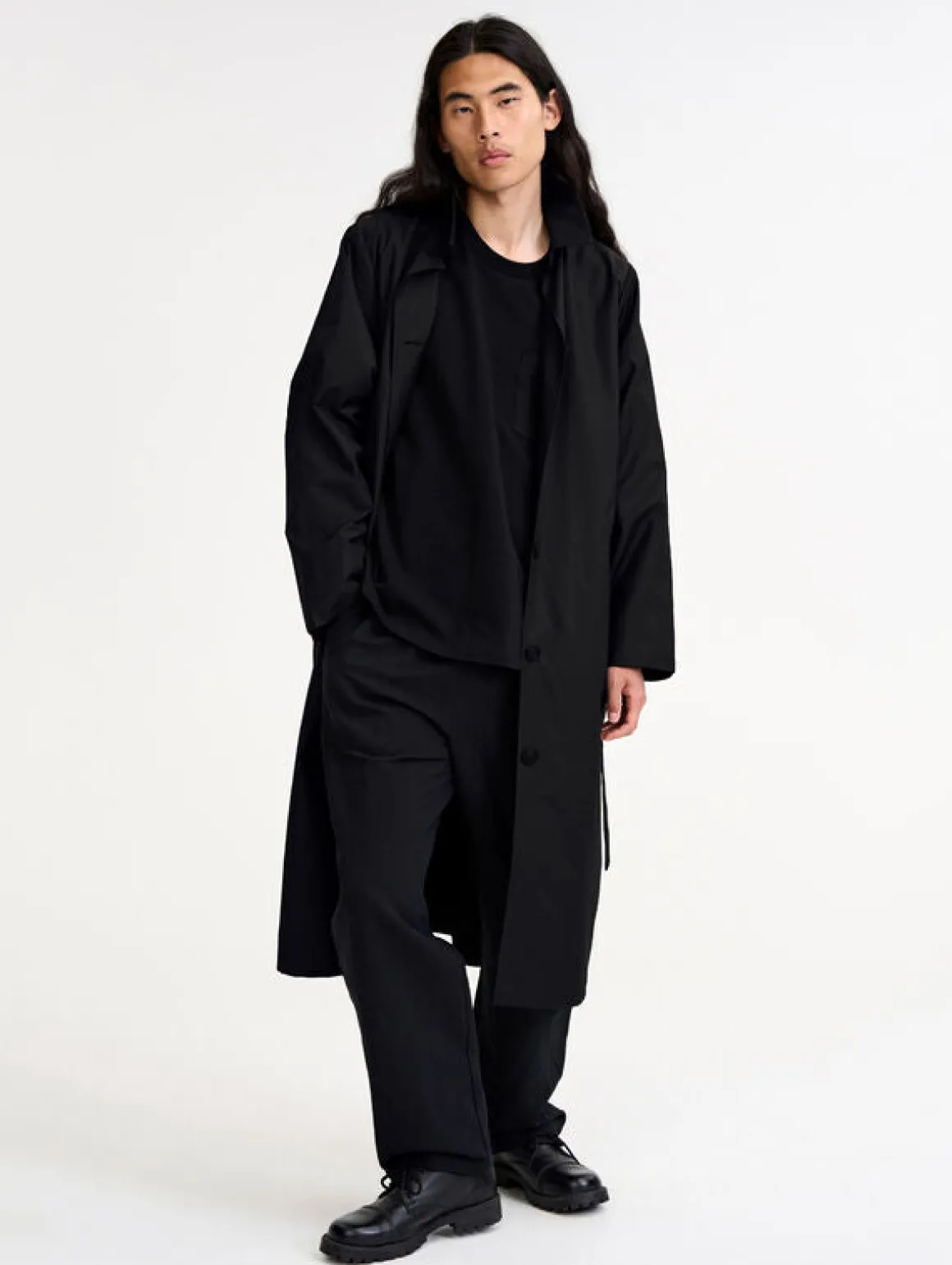 Pohjepituinen vuorillinen trenssitakki. Väljä mitoitus. Italiassa valmistettu laadukas puuvillasekoitekangas on vettähylkivä. Kankaan käsittelyssä ei ole käytetty fluorikarbonaattiyhdisteitä, eli tuote on PFC/PFAS-vapaa. Kaulukset, nappikiinnitys ja leveä solmittava irtovyö. Pitkät suorat hihat, hihansuissa kääntövara. Sivutaskut, selässä takakaarroke ja helmassa halkio. Niskassa brodeerattu puu-logo.